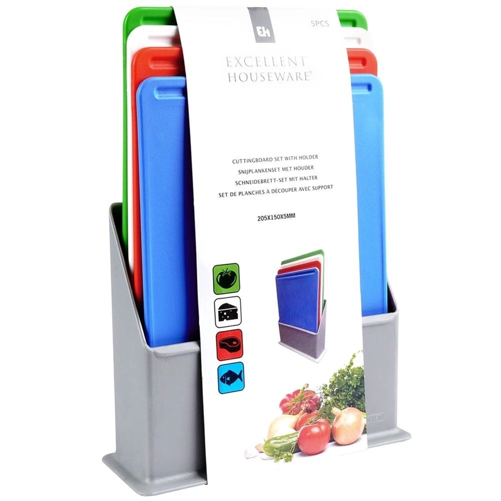 - PRZYDATNE - Zestaw czterech desek kuchennych w stojaku. Każda z desek ma inny kolor. Wymiar deski wynosi 20.5 x 15 x 0,5 cm. Przydatne w każdym domu.