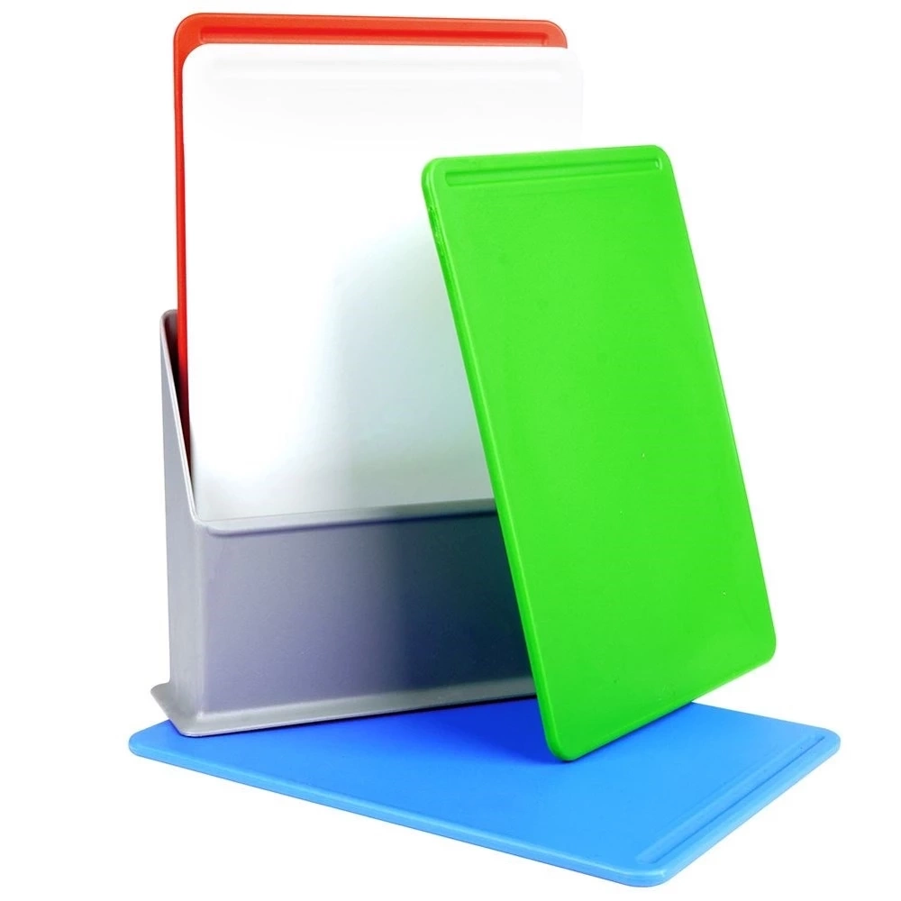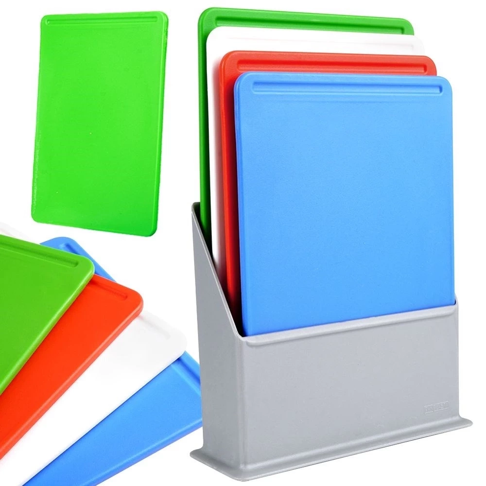 - Komplet czterech desek kuchennych do krojenia w stojaku. Każda w innym kolorze i innym przeznaczeniem - do mięsa, serów, warzyw i owoców oraz ryb.