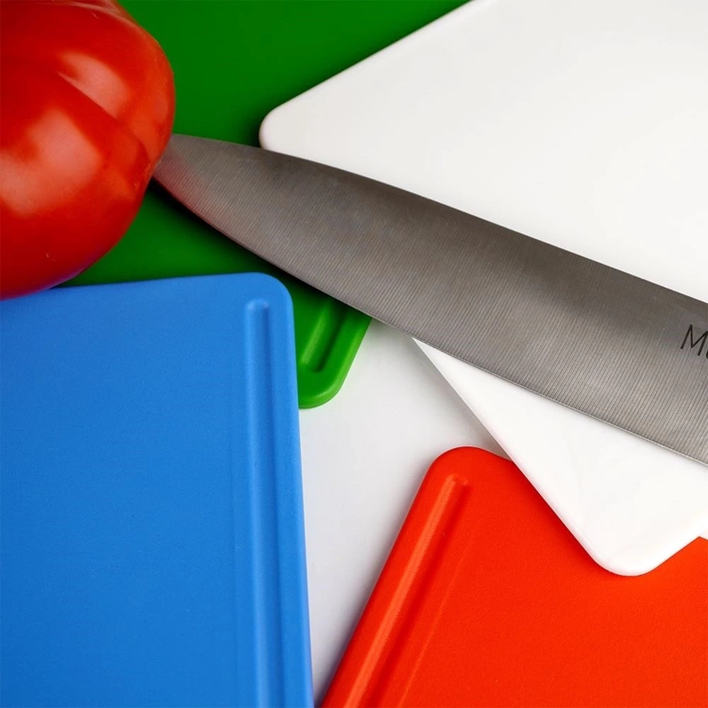 - FUNKCJONALNE - Każda z desek ma inny kolor oraz inne przeznaczenie. Deska niebieska jest przeznaczona do ryb, czerwona do mięsa, biała do sera a zielona do owoców i warzyw.