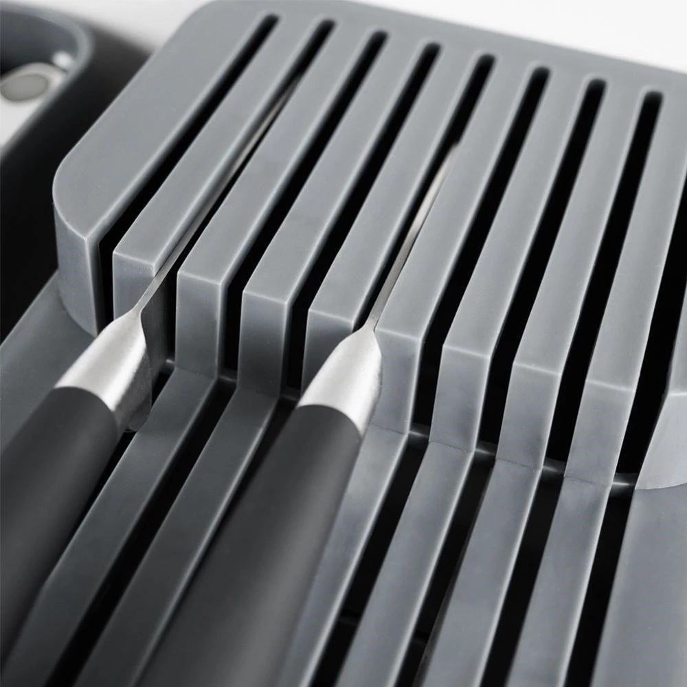 - POJEMNY - Posiada aż 18 miejsc na noże długie oraz krótkie. Z jego pomocą noże będą miały odpowiednie miejsce w szufladzie.