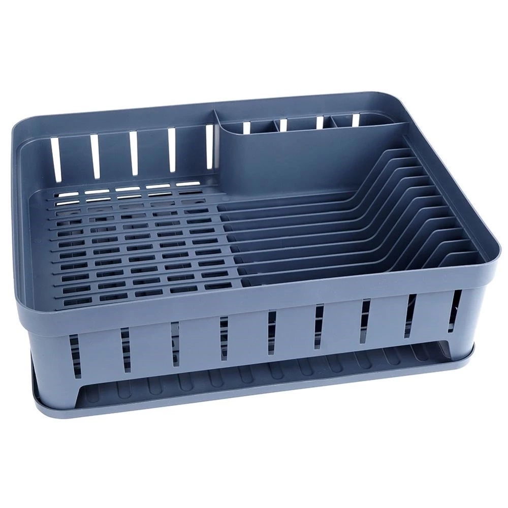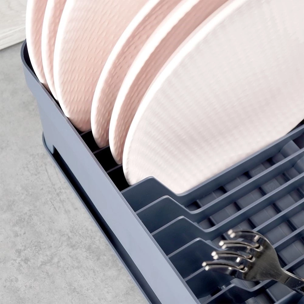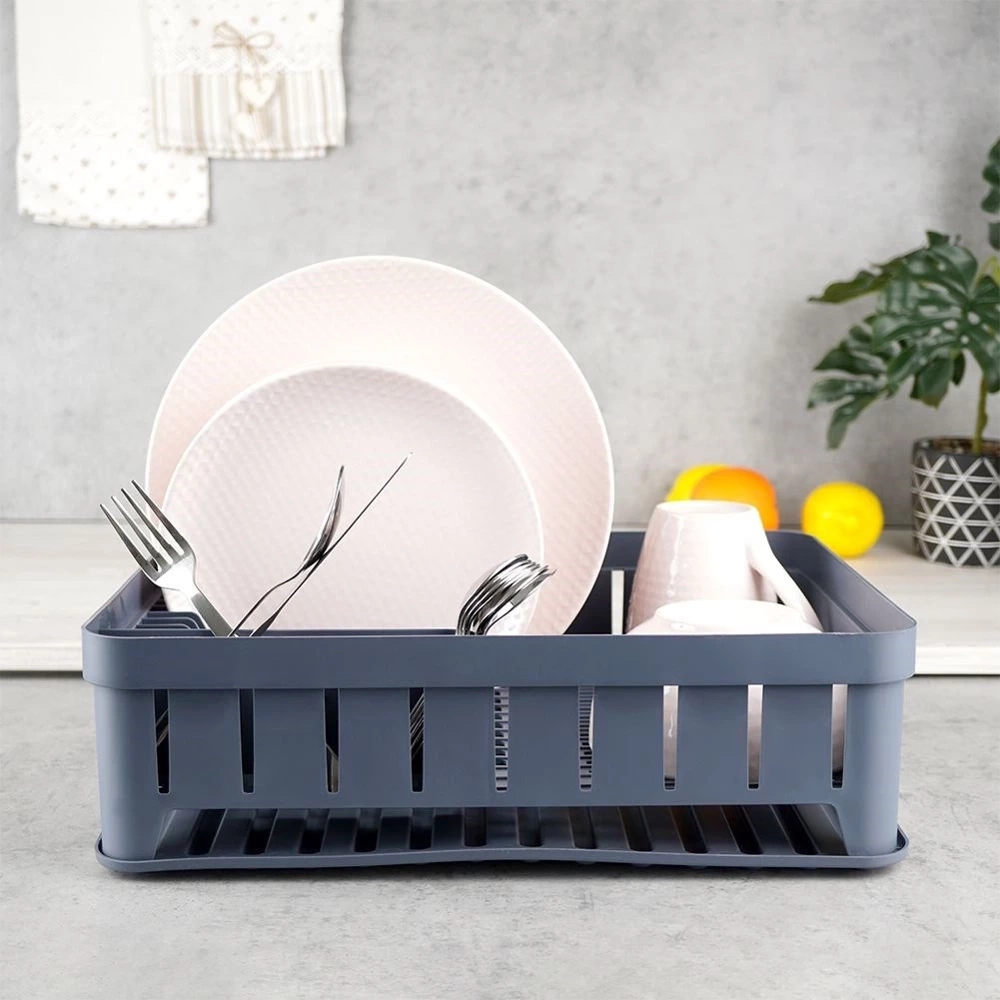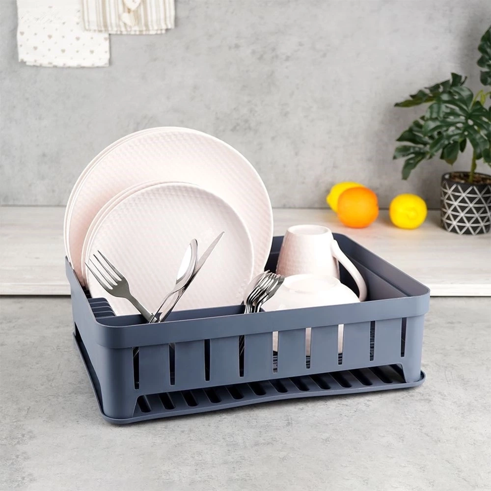 - Praktyczna suszarka do naczyń. Wykonana z tworzywa w kolorze grafitowym. Posiada miejsce na talerze, szklanki oraz sztućce. Posiada wyjmowaną, elastyczną tacę ociekową
