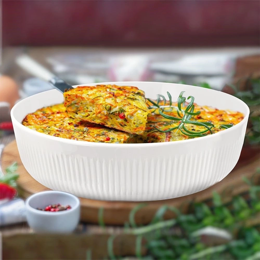 - PRZYDATNE - Żaroodporne naczynie do zapiekania, idealne do wszystkich wypieków, które kochasz. Niezależnie od tego, czy są to słone potrawy jak makarony, ziemniaki, pieczone warzywa, zapiekanki, czy słodkie desery jak domowe tiramisu. Naczynie ma średnicę 29 cm a wysokość 8 cm. Pojemność naczynia wynosi 4 litry.