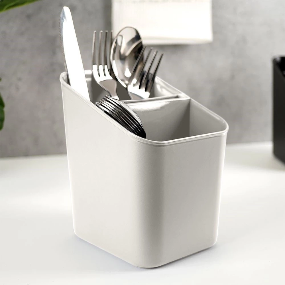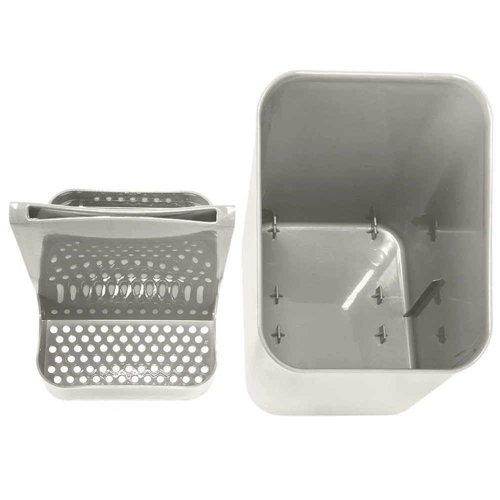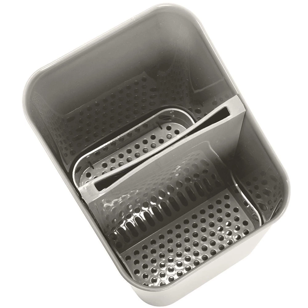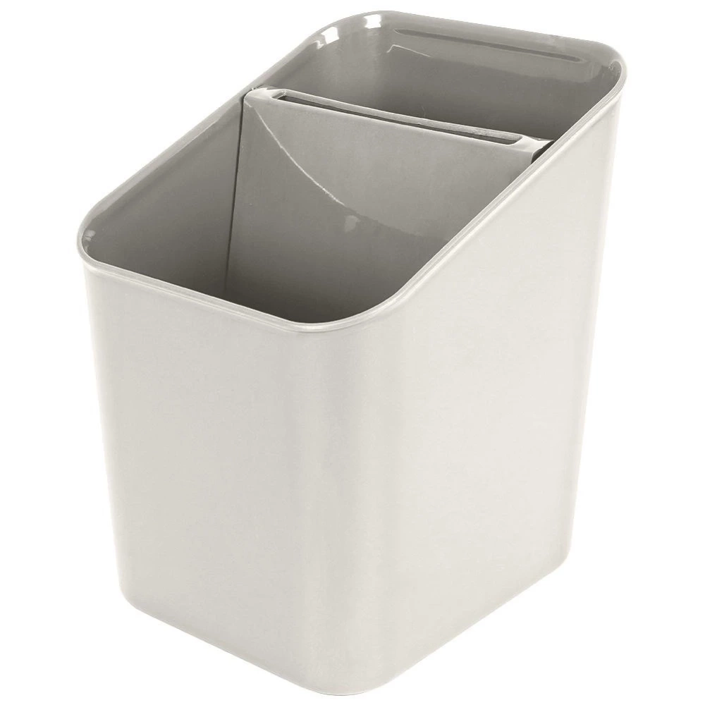 - Pojemnik z 2 przegródkami, wykonany z wysokiej jakości tworzywa w kolorze popielatym. Świetnie sprawdzi się do ociekania oraz przechowywania sztućców, przyborów kuchennych.