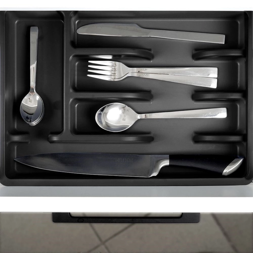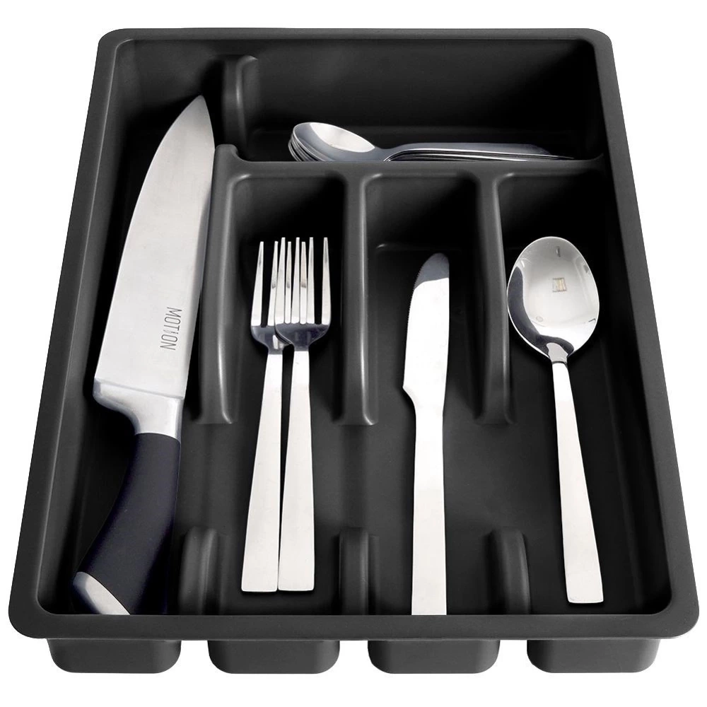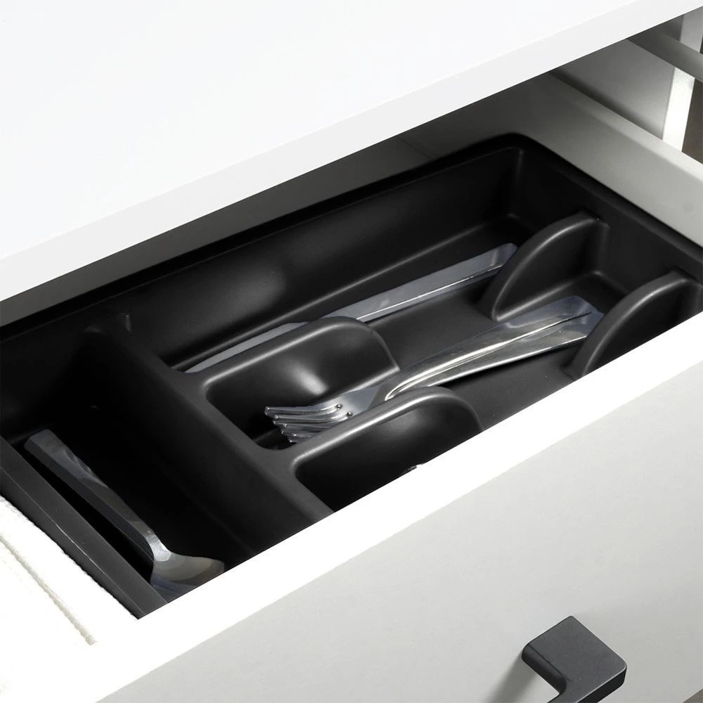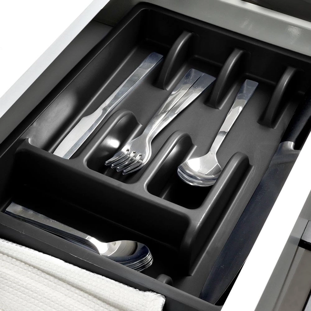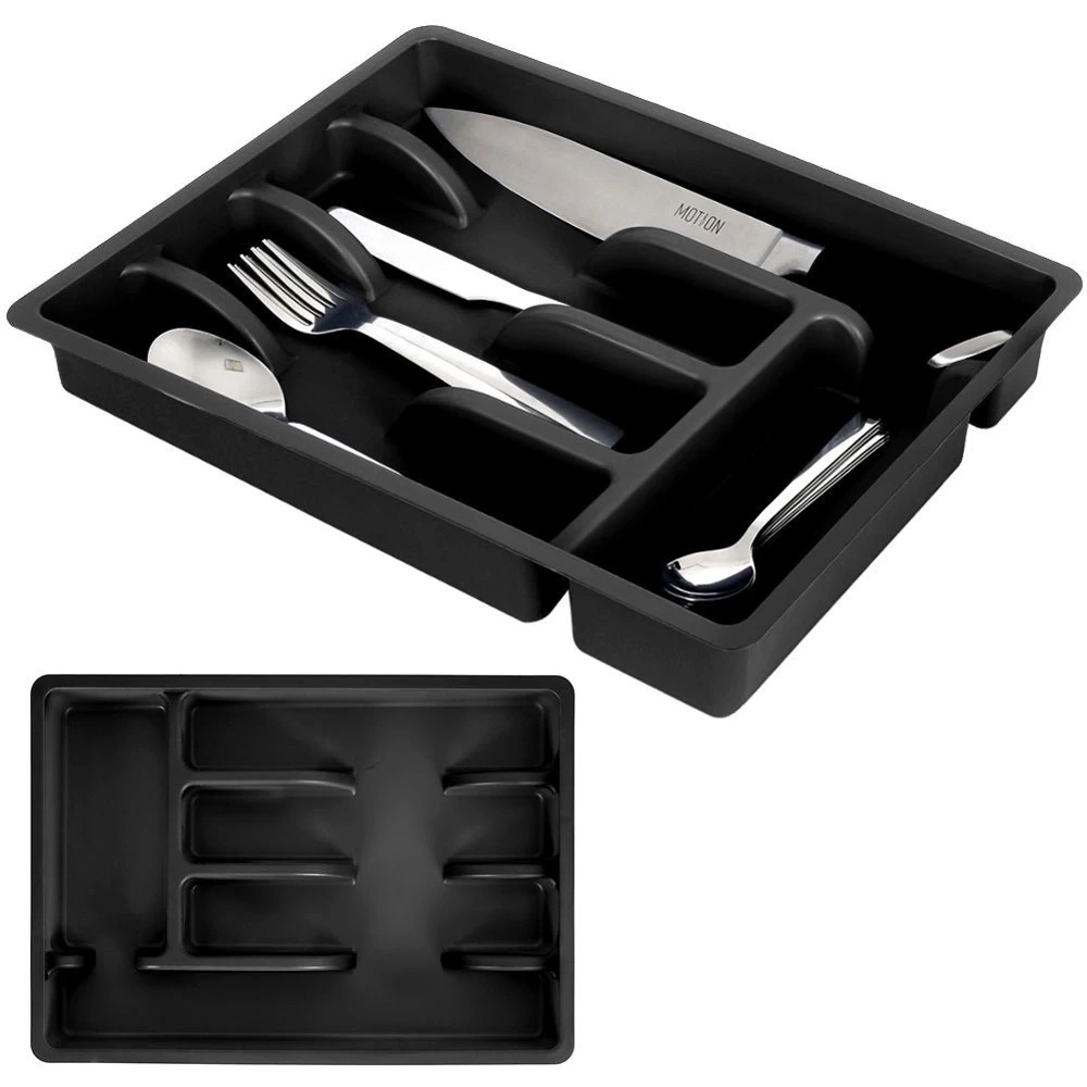 - Organizer na sztućce do szuflady. Wykonany z wysokiej jakości tworzywa w czarnym kolorze. Łącznie posiada 5 przegródek na sztućce, łyżeczki oraz przybory kuchenne.