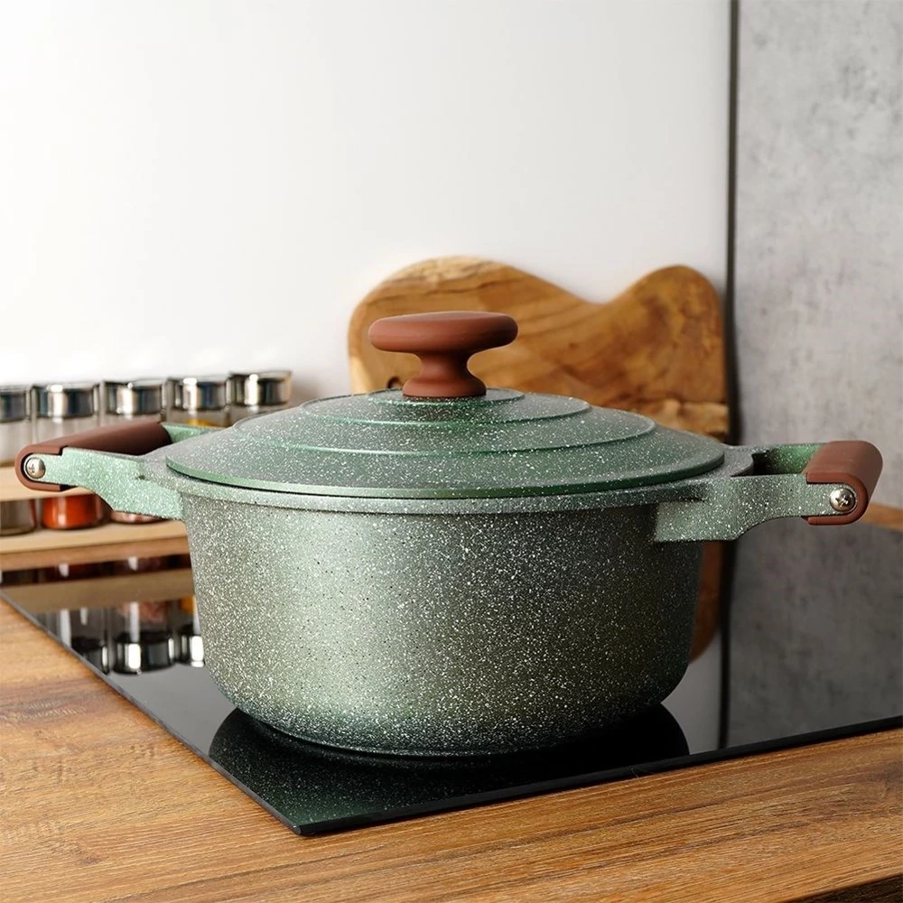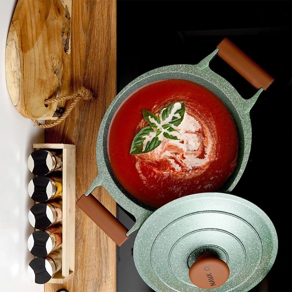 Nieprzywierający garnek o wyjątkowym, ponadczasowym wyglądzie. Garnek ma piękny ciemnozielony kolor, oraz brązowe wstawki, dzięki czemu efektownie prezentuje się w kuchni. Garnek sprawdzi się do gotowania oraz duszenia, przygotujemy w nim różnego rodzaju dania, zupy czy sosy. Efektownie prezentuje się w kuchni oraz podczas serwowania dań bezpośrednio na stole. Oryginalny produkt greckiej marki NAVA z linii naczyń Omega. Wyprodukowano zgodnie z europejskimi standardami.