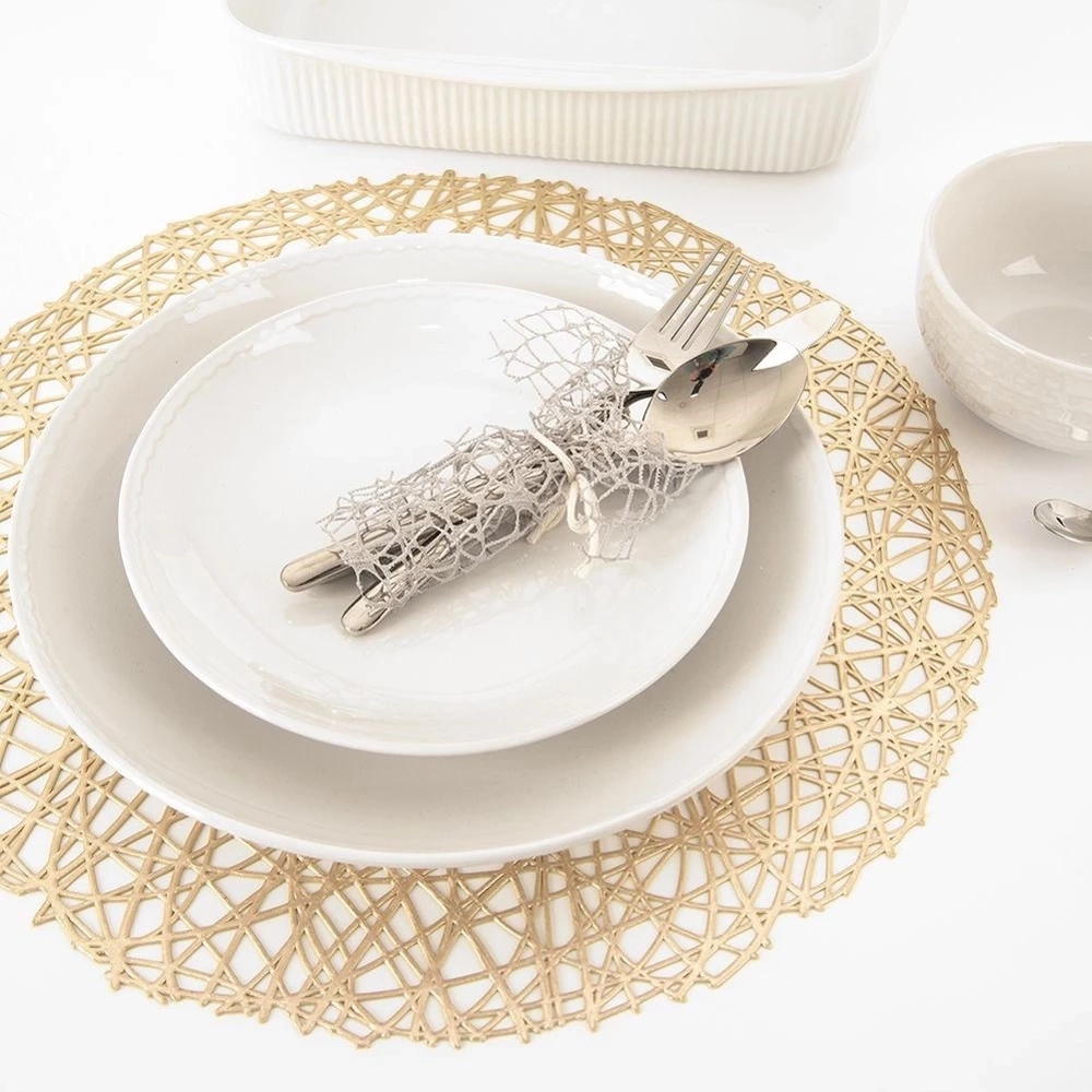 - Okrągła podkładka kuchenna wykonana z termoplastycznego tworzywa. Stanowi piękne tło dla zastawy stołowej i sztućców. Posiada piękny, połyskujący, złoty kolor.
