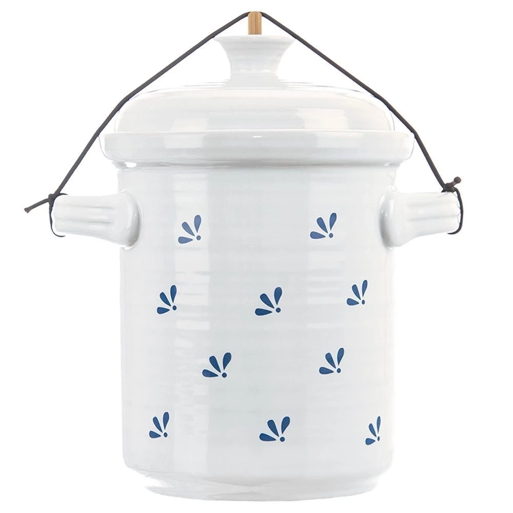 - Garnek do kiszenia ogórków, kapusty lub innych warzyw. Wykonany z ceramiki w kolorze białym z granatowym motywem. Posiada wewnętrzną pokrywkę, gumkę oraz trzonek.