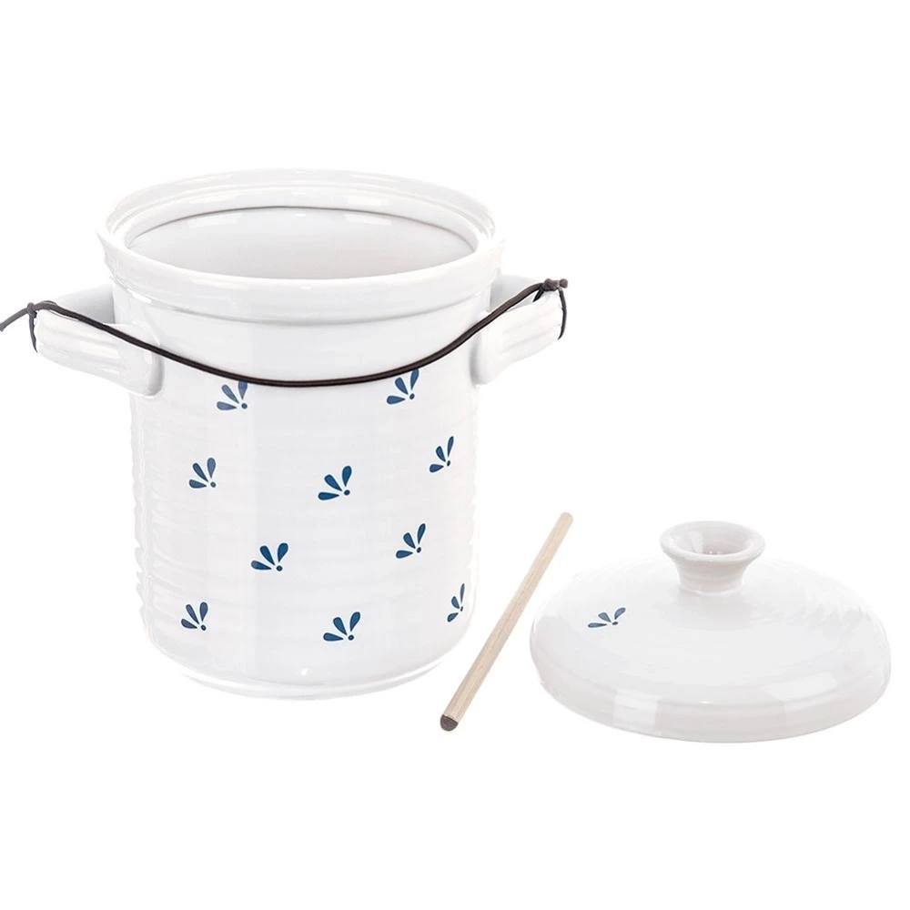 - CERAMICZNY - Wykonany z najwyższej jakości ceramiki w kolorze białym z granatowym motywem. Garnek jest wykonany z użytkowej ceramiki glazurowanej, która nie przepuszcza światła, dzięki czemu utrzymuje stałą temperaturę żywności, co zapewnia lepsze warunki dla dojrzewania i dobrego smaku.