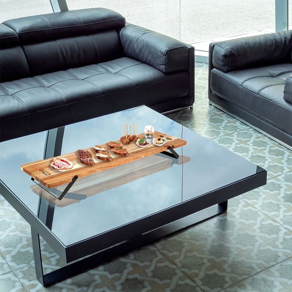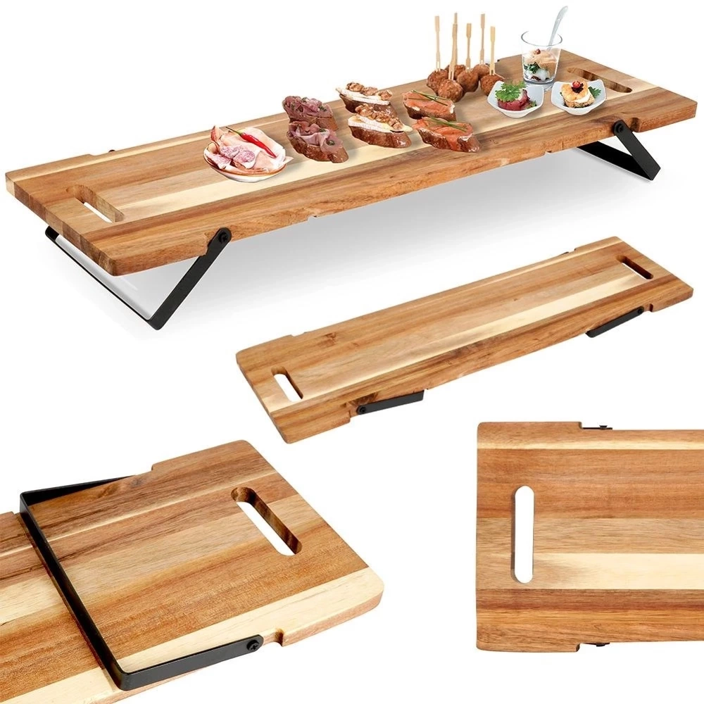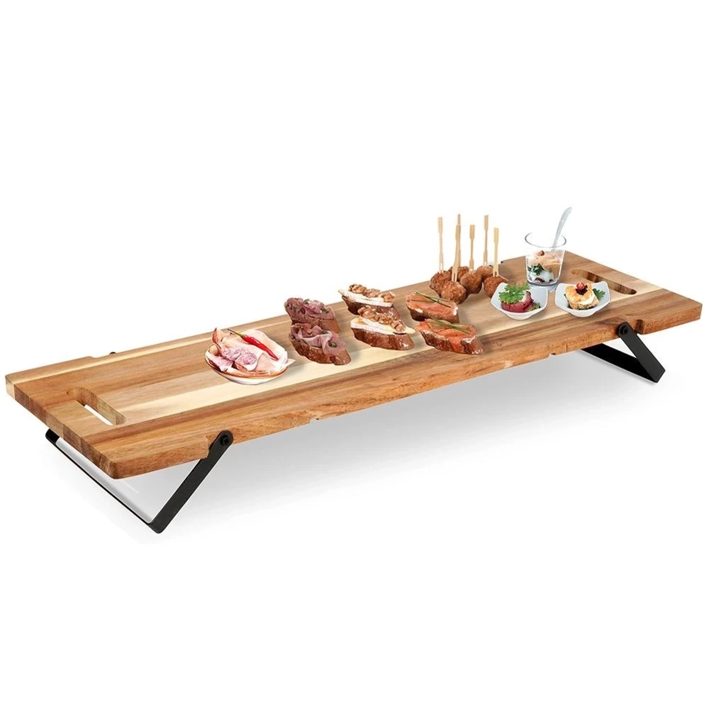 - Taca do serwowania na składanych nóżkach. Wykonana z drewna akacjowego a nóżki z metalu w kolorze czarnym. Świetnie prezentuje się na stole. Łatwe przenoszenie.