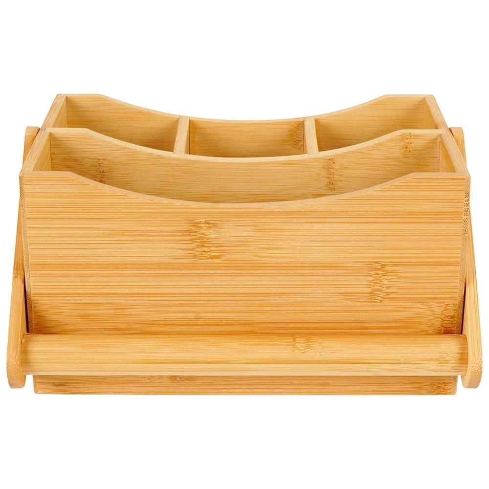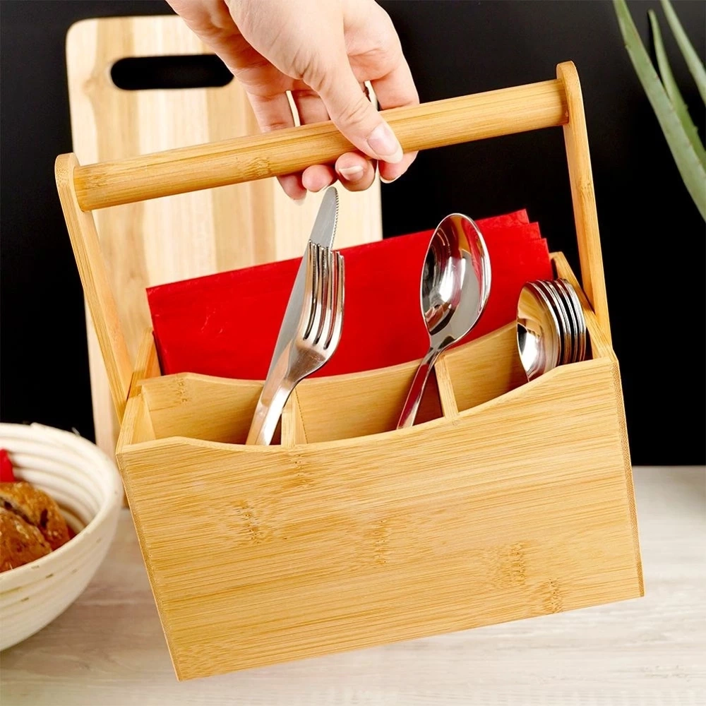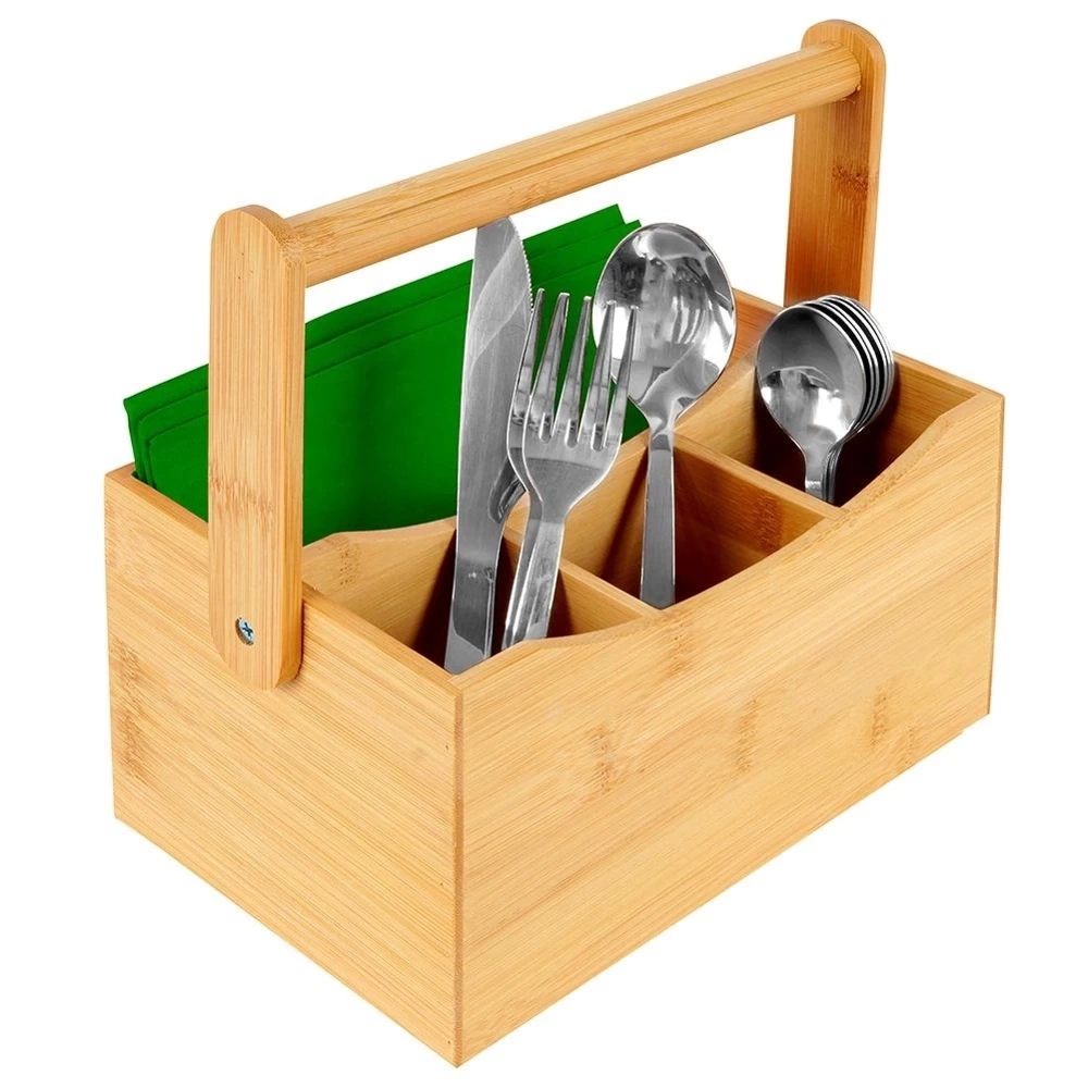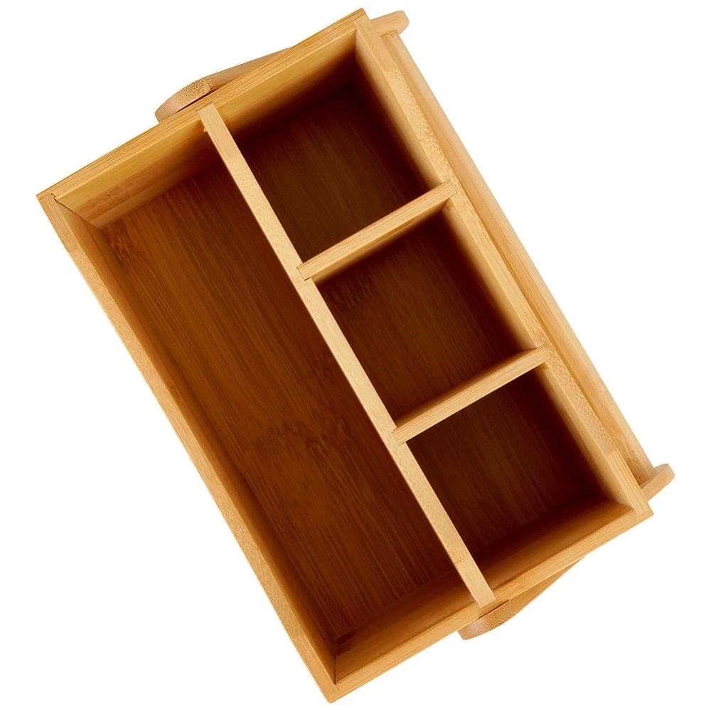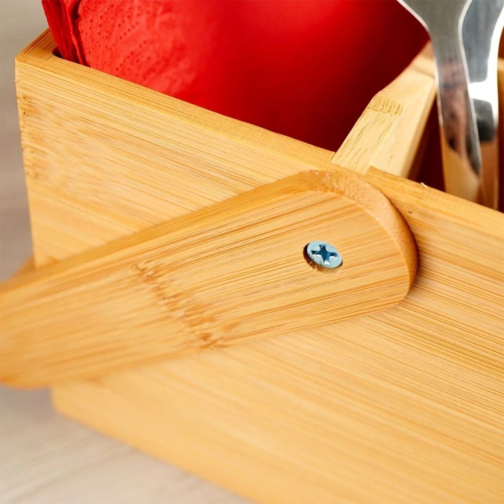 - Pojemnik w formie skrzynki z 4 przegródkami. Solidnie wykonany z drewna bambusowego. Wykorzystamy go przechowywania sztućców, ale również sosów czy przypraw.