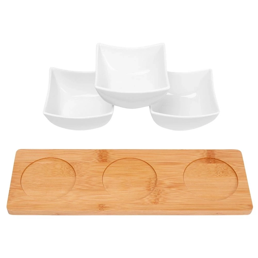 - Zestaw trzech porcelanowych miseczek na bambusowej tacy. Sprawdzą się do serwowania przekąsek, przystawek, sosów, dipów i innych.