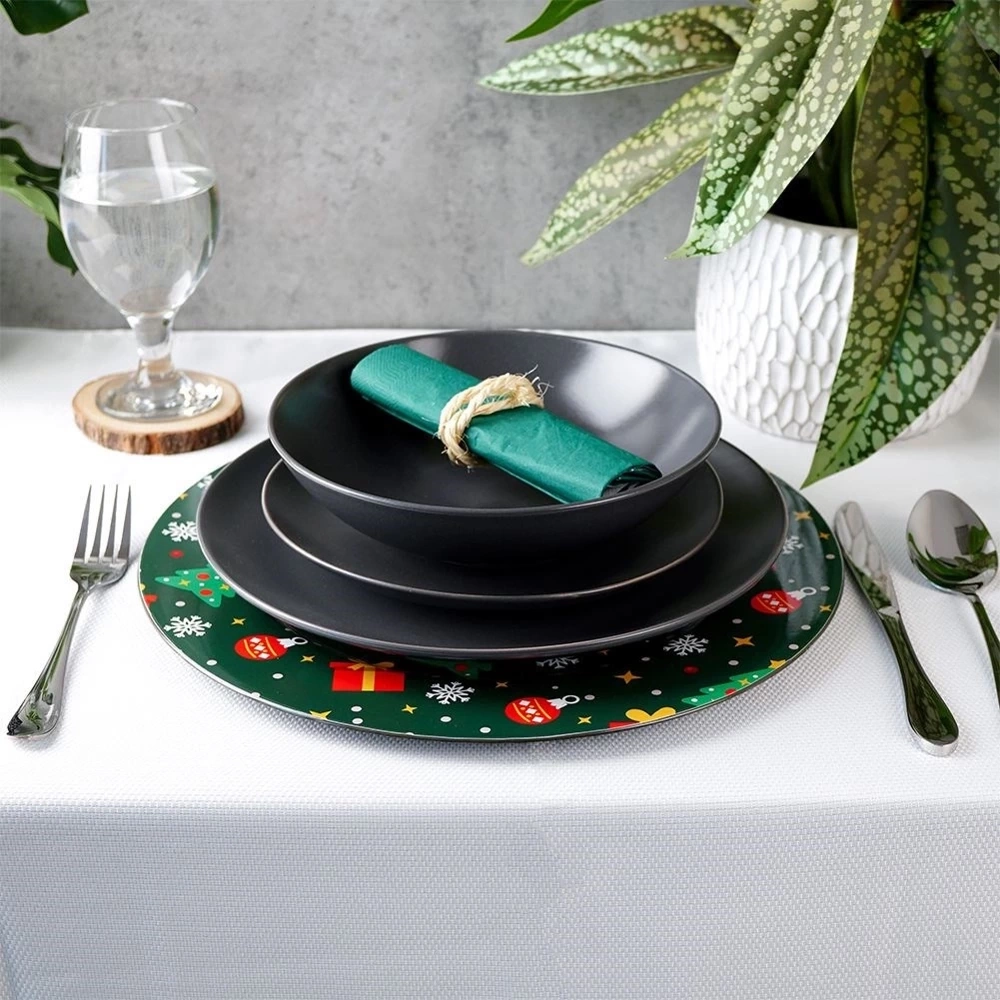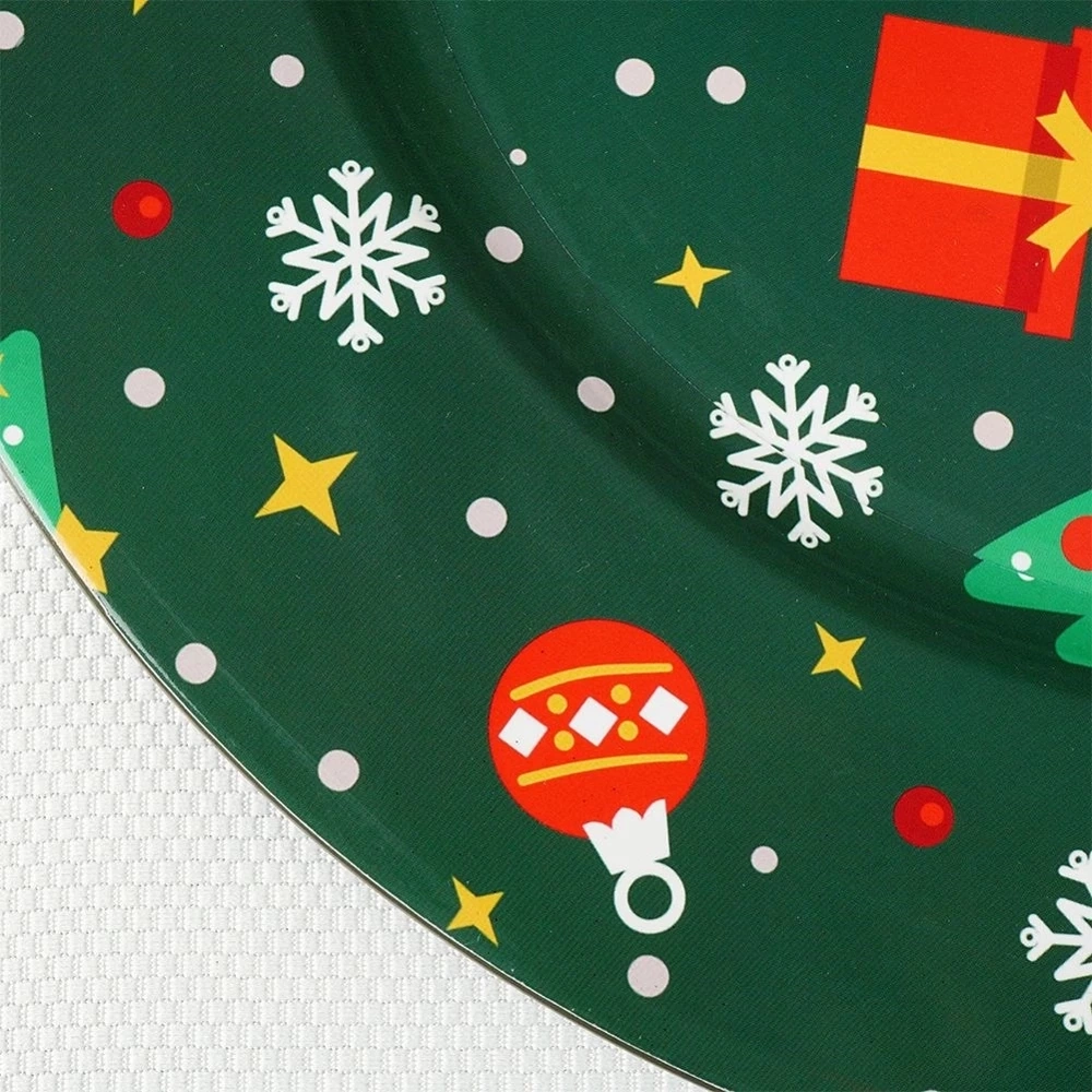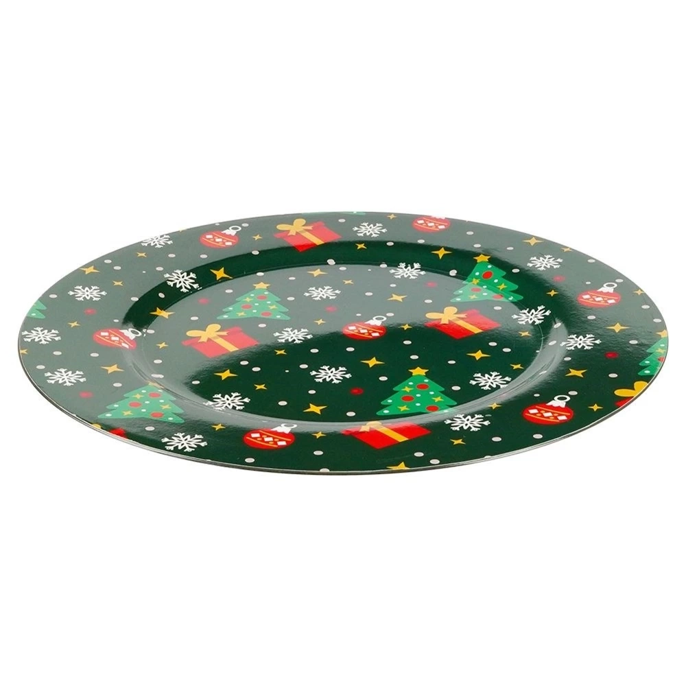 - Okrągła podkładka pod talerze o średnicy 33 cm. Wykonana z wysokiej jakości tworzywa w zielonym kolorze z motywem choinek i prezentów. Idealna w okresie świątecznym.