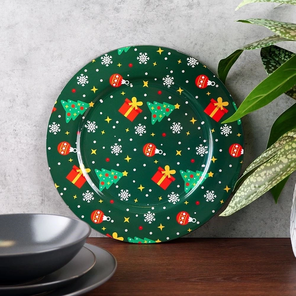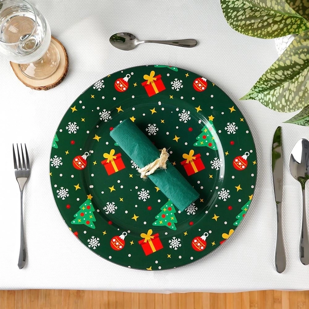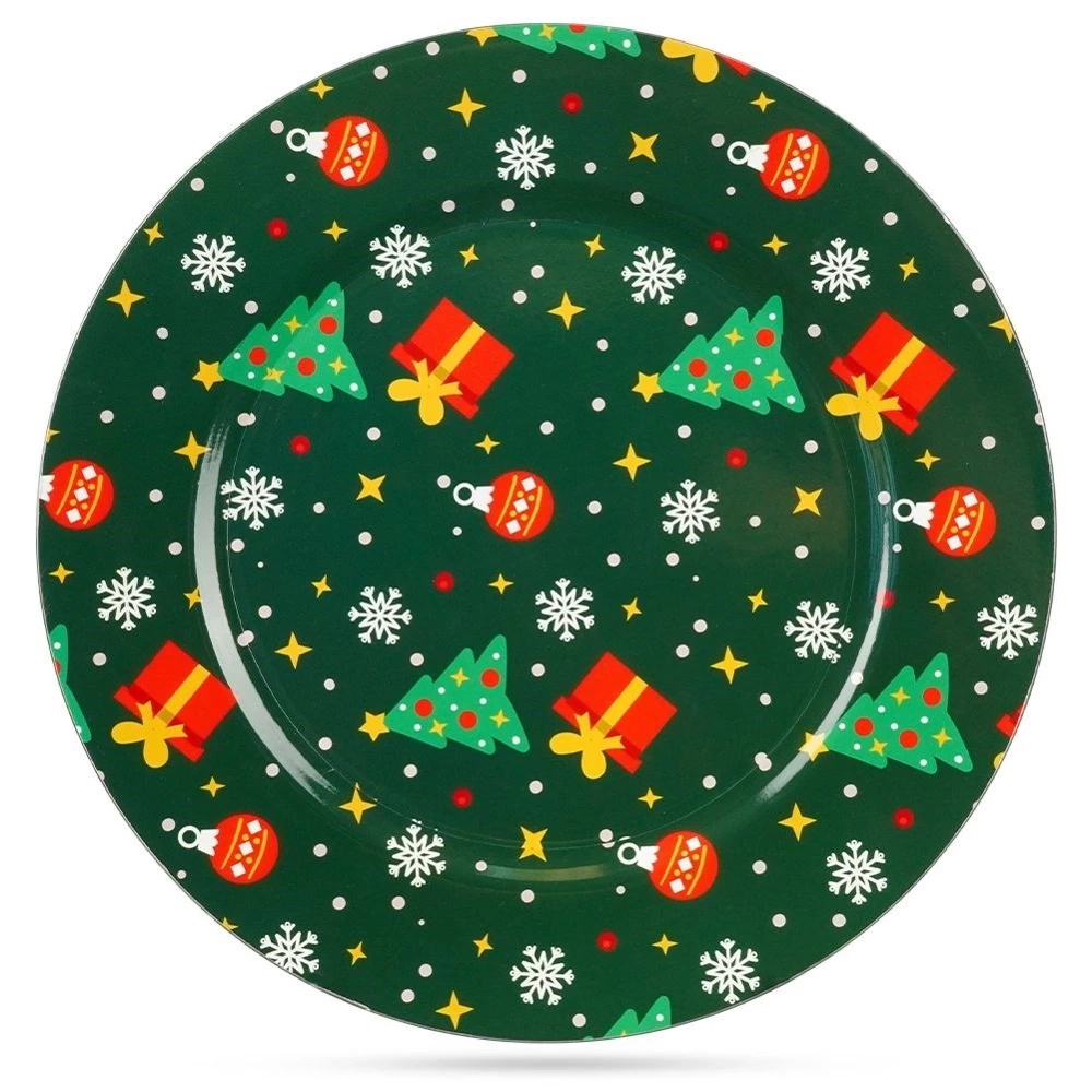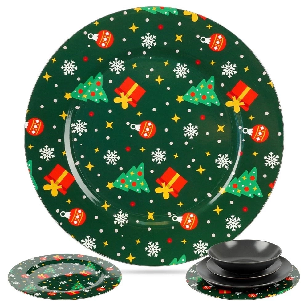- Okrągła podkładka pod talerze o średnicy 33 cm. Wykonana z wysokiej jakości tworzywa w zielonym kolorze z motywem choinek i prezentów. Idealna w okresie świątecznym.