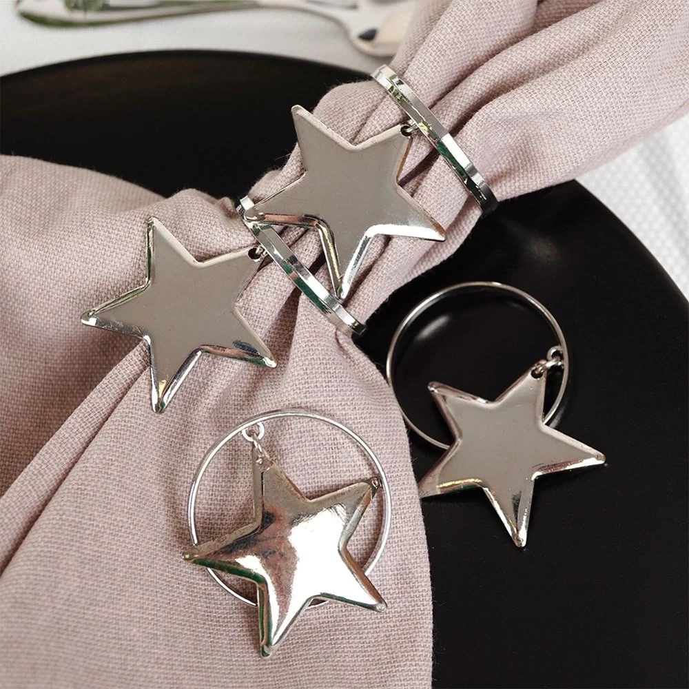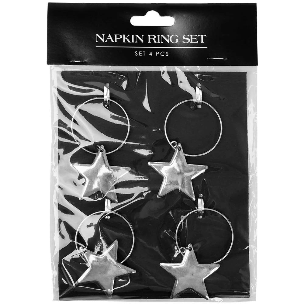 - Zestaw 4 szt. obrączek na serwetki o średnicy 4 cm. Wykonane z wysokiej jakości metalu w kolorze srebrnym, zaczepione są na nich efektowne gwiazdki.