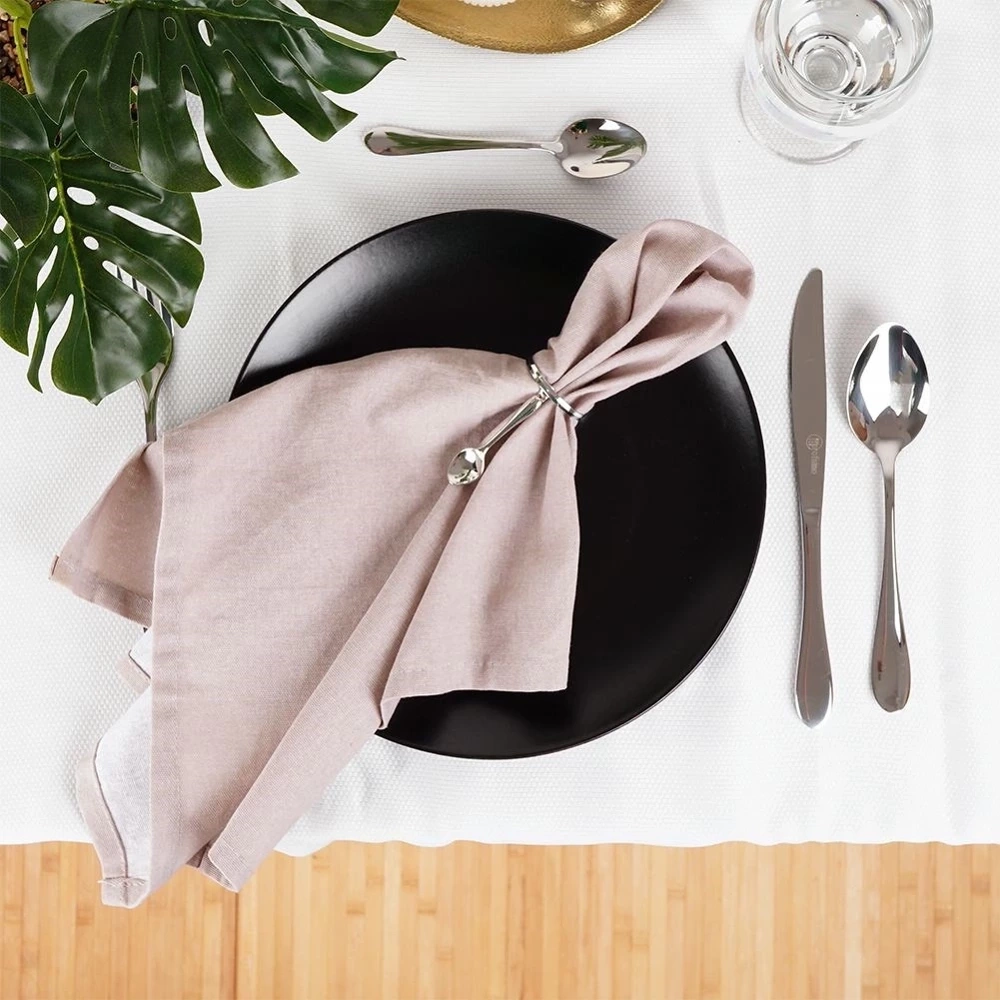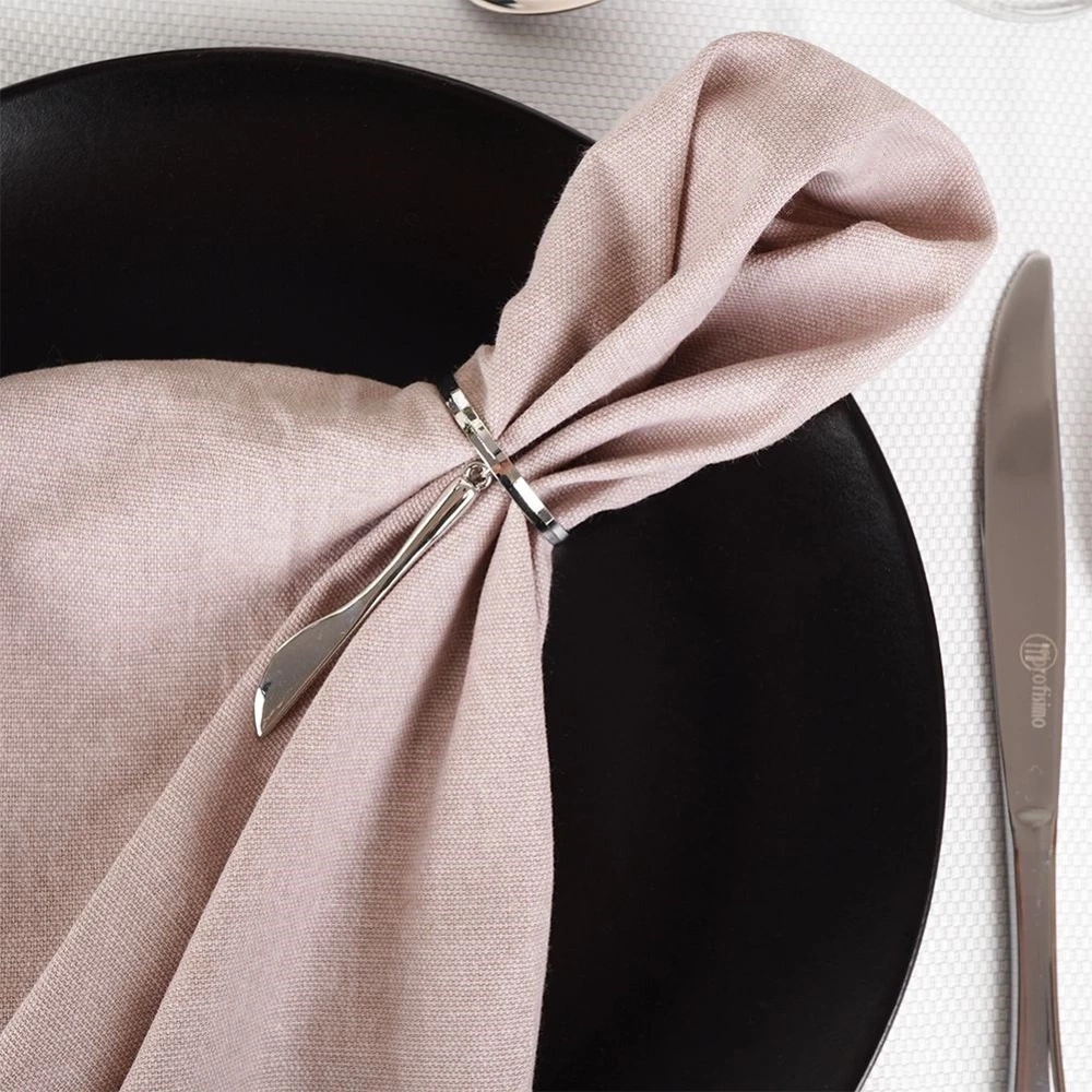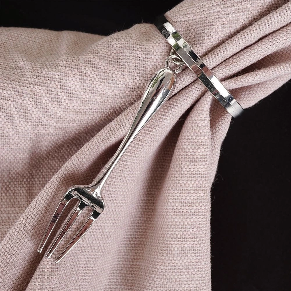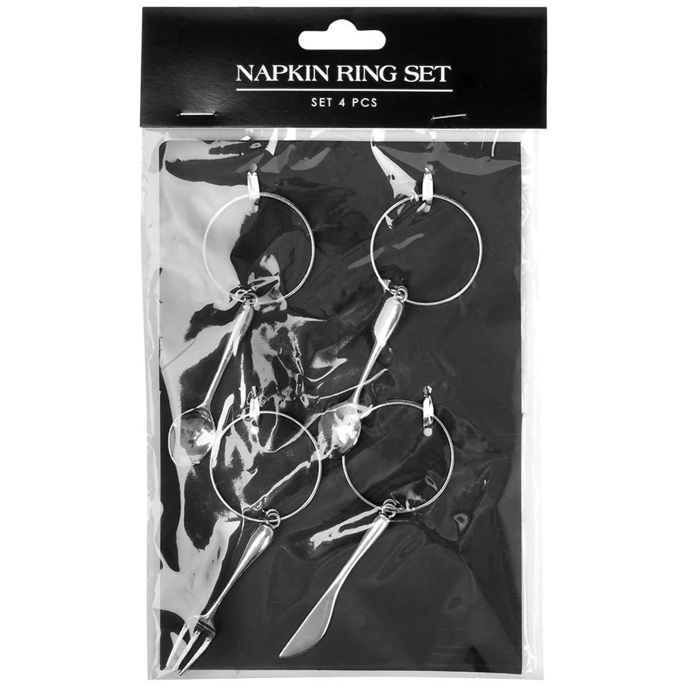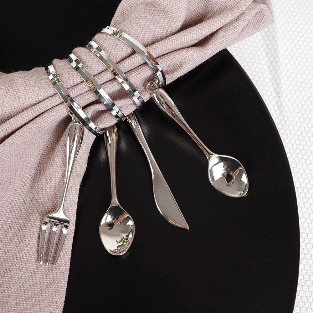 - Zestaw 4 szt. obrączek na serwetki o średnicy 4 cm. Wykonane z wysokiej jakości metalu w kolorze srebrnym, zaczepione są na nich efektowne sztućce.