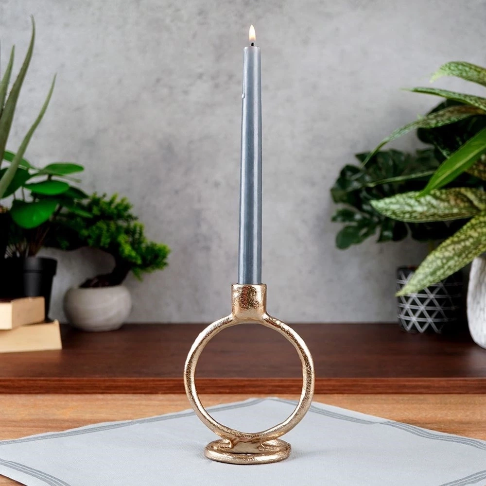 - SOLIDNY - Wykonany z najwyższej jakości aluminium w złotym kolorze. Świecznik posiada okrągłą podstawę, która zapewni stabilność.