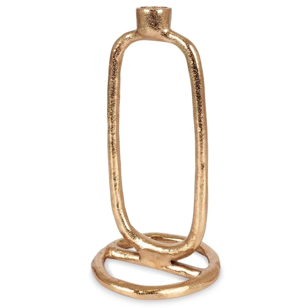 - Świecznik w klasycznym stylu na długą świeczkę. Wykonany z aluminium w kolorze złotym. Niezwykle elegancki i minimalistyczny. Będzie wyjątkową ozdobą.
