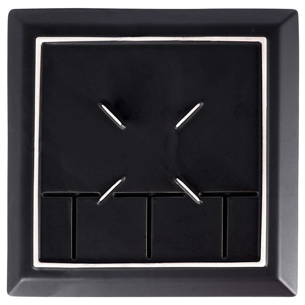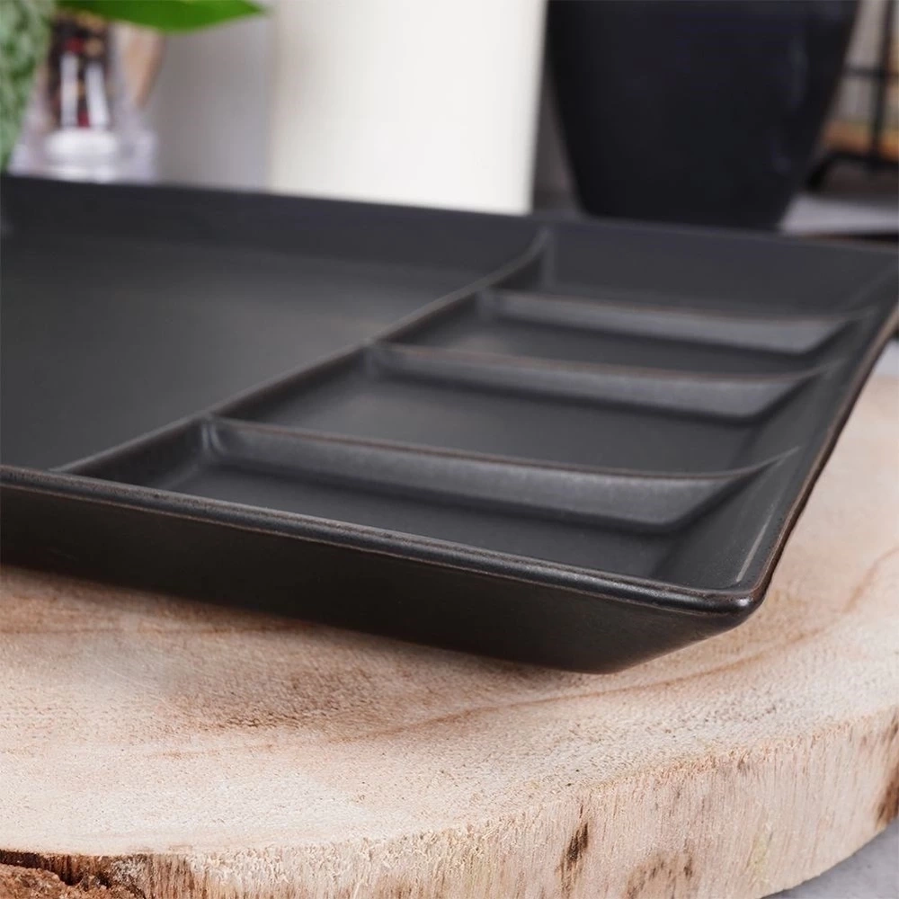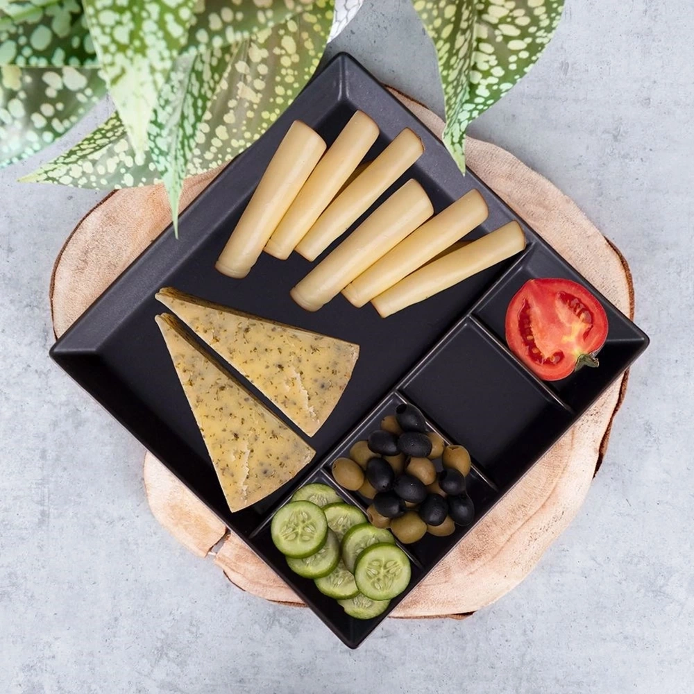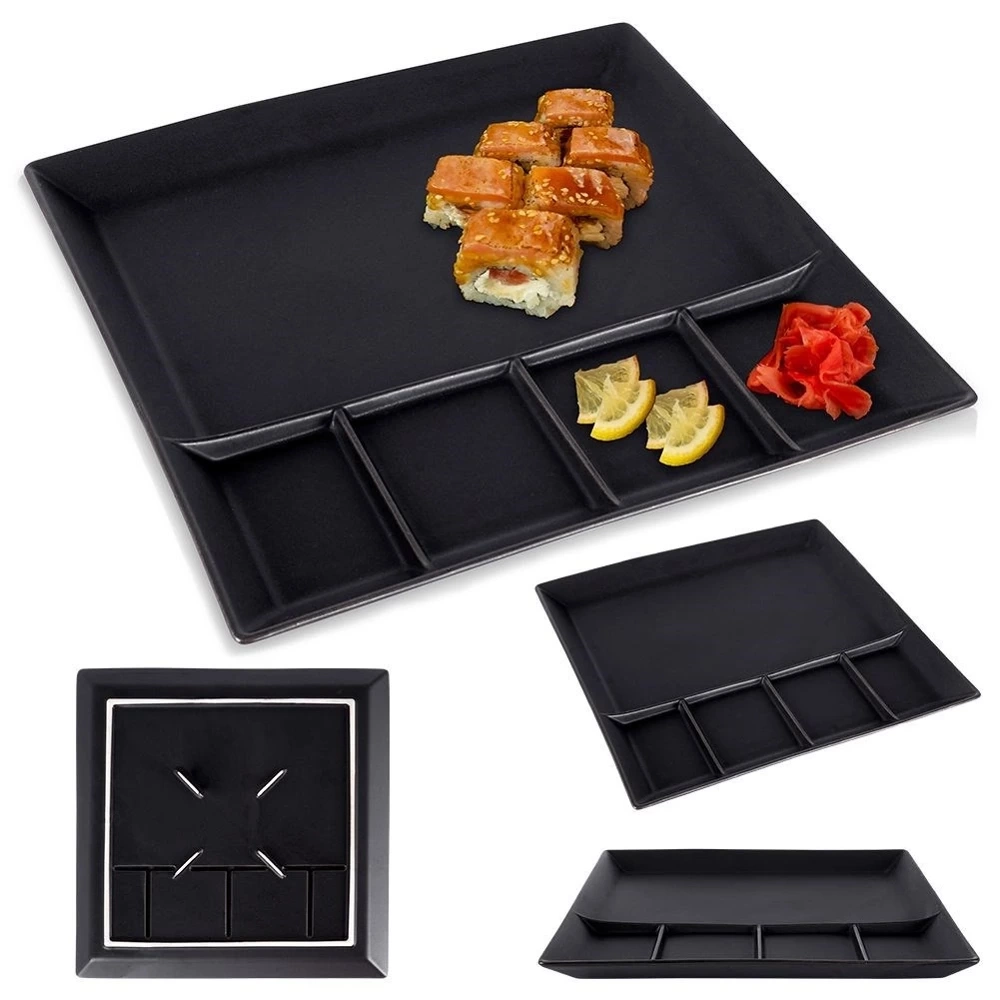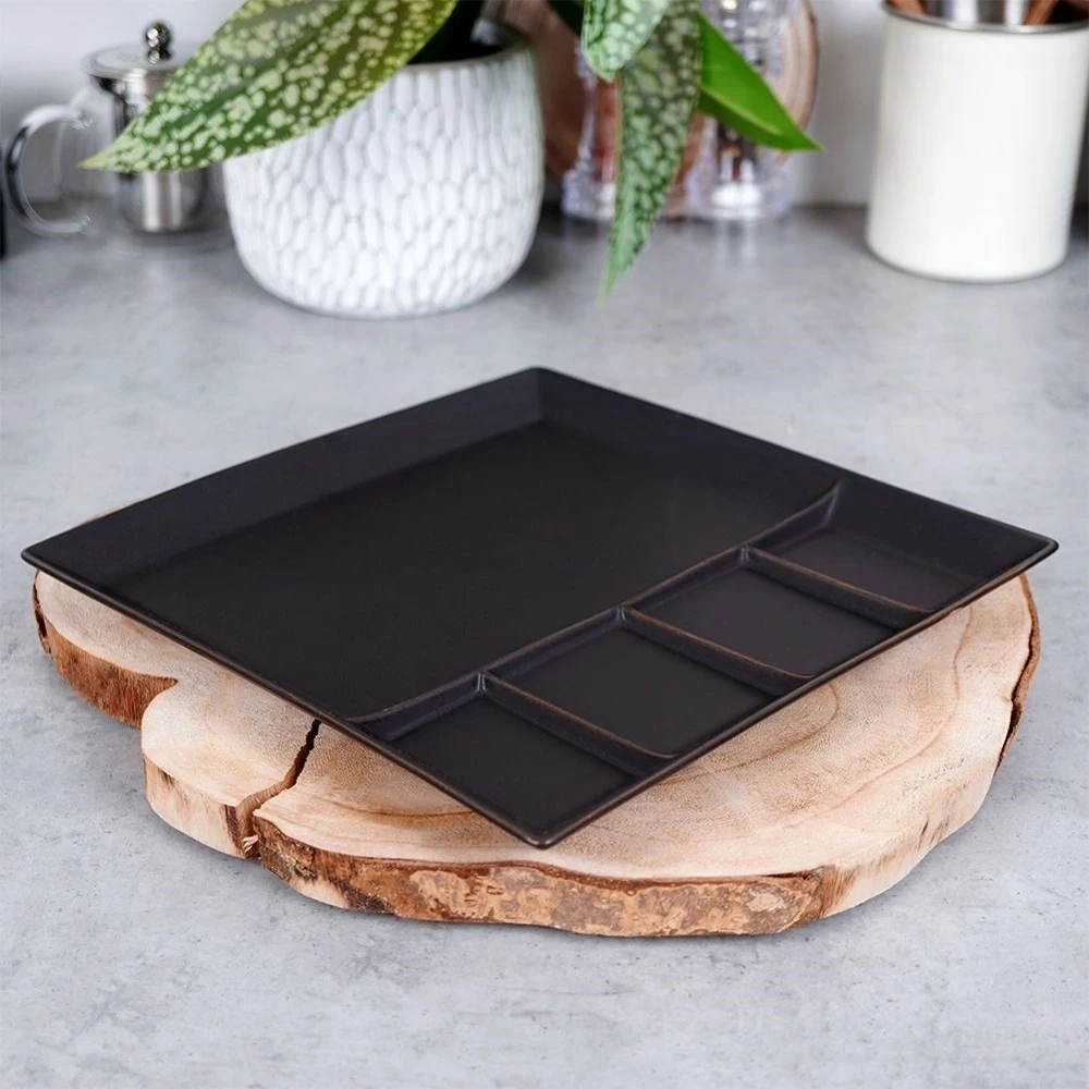 - Kwadratowy talerz do podawania i serwowania przekąsek. Idealny jako talerz obiadowy. Wykonany z porcelany w kolorze czarnym. Talerz dzielony na pięć części.