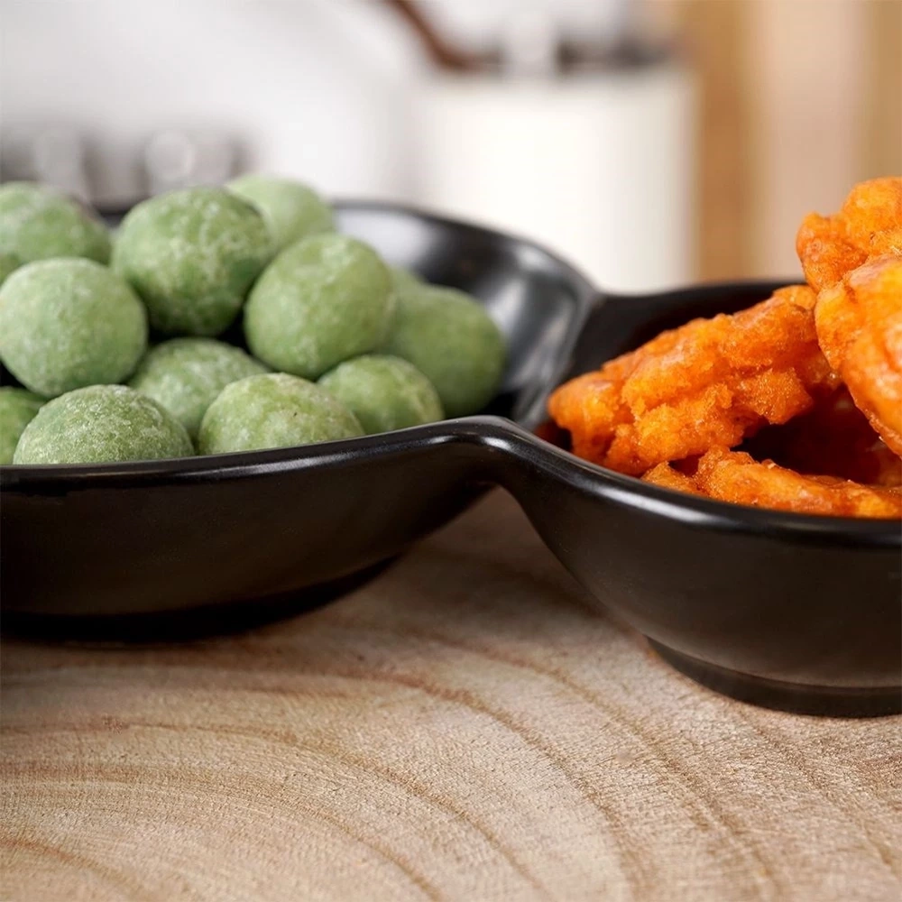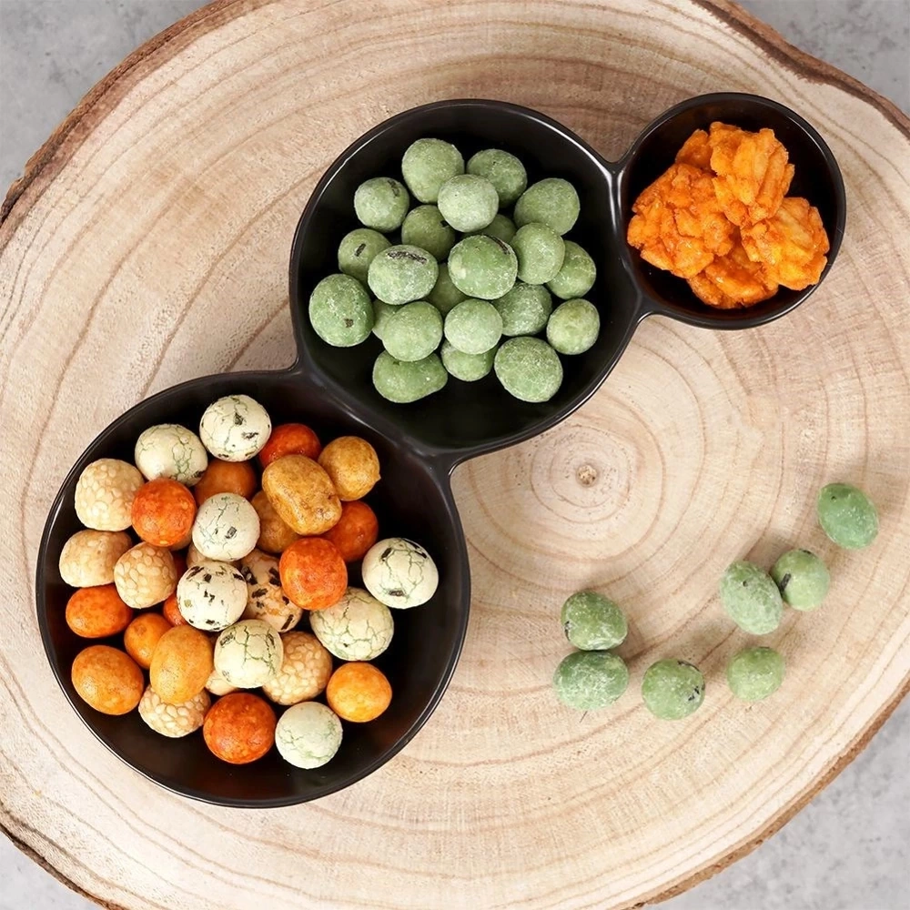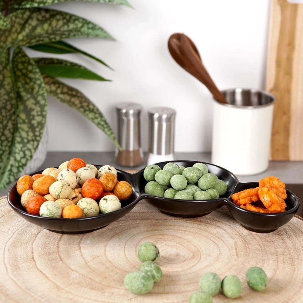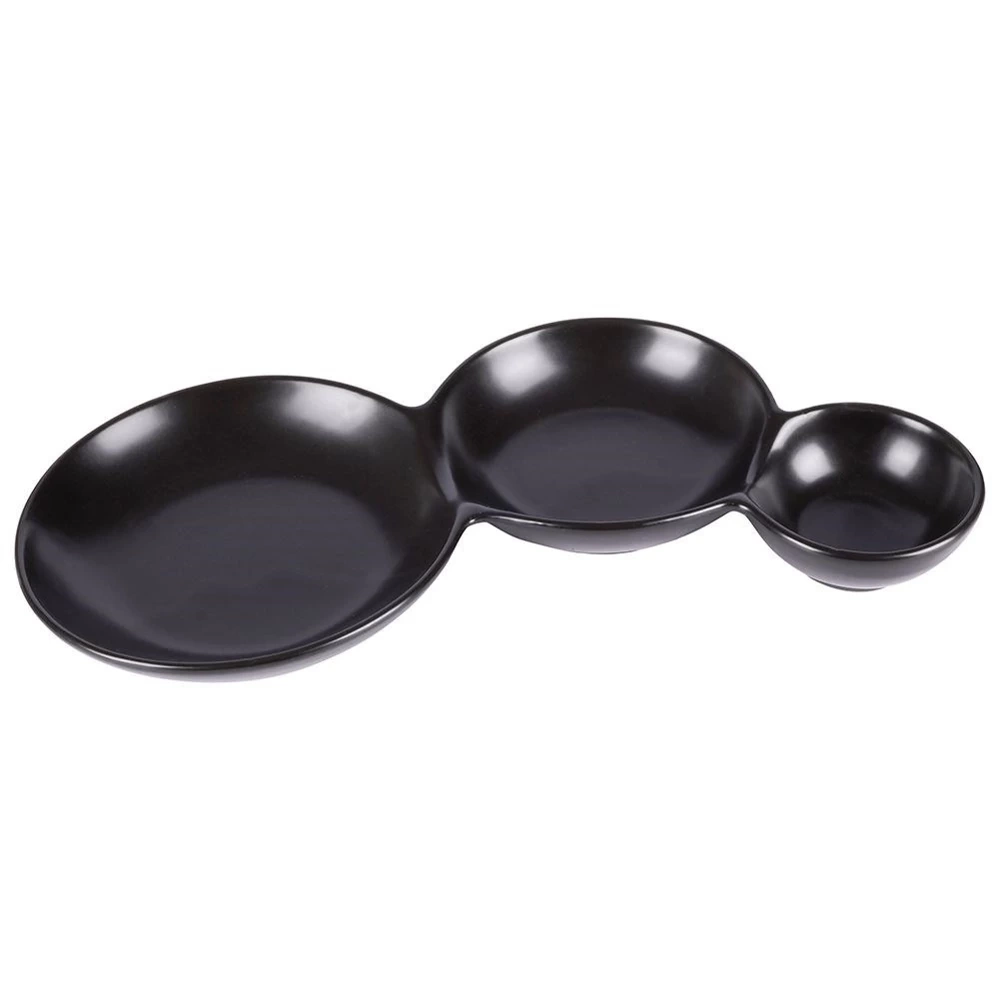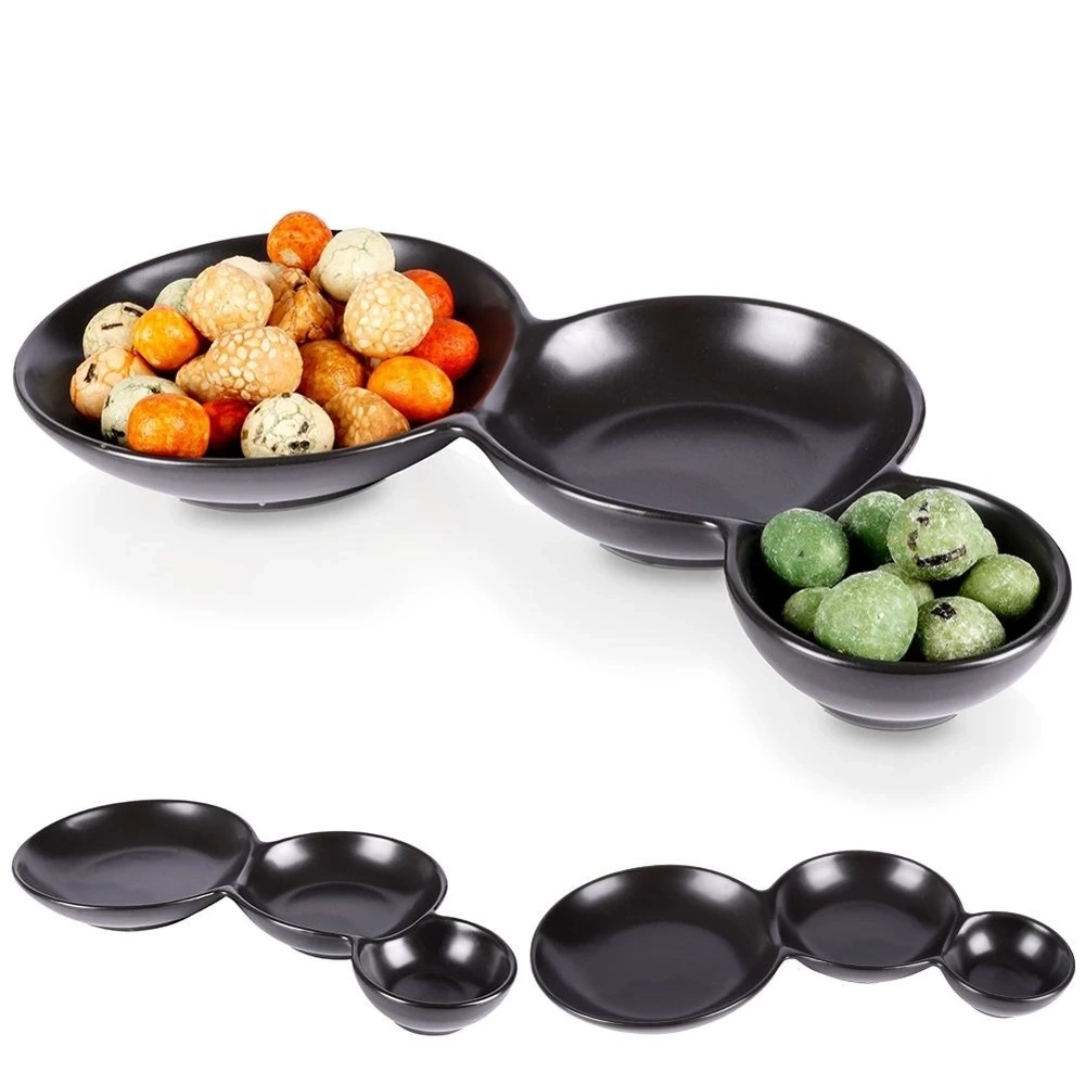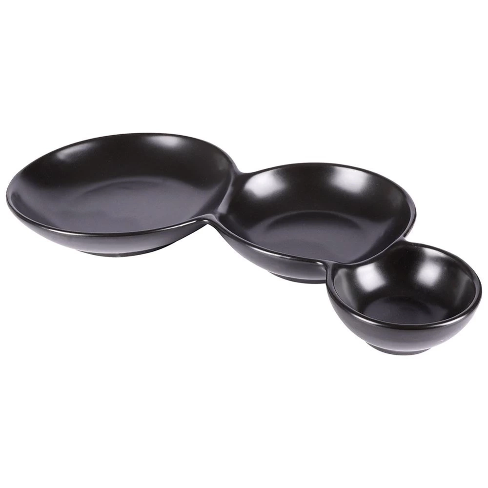 - Miska na przekąski wykonana z czarnej porcelany. Podzielona jest na trzy mniejsze miseczki, które tworzą razem jedną całość. Idealna na dipy oraz przekąski.