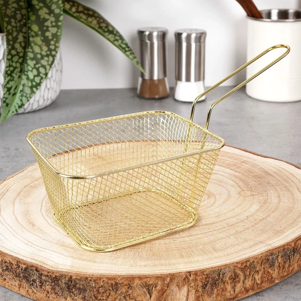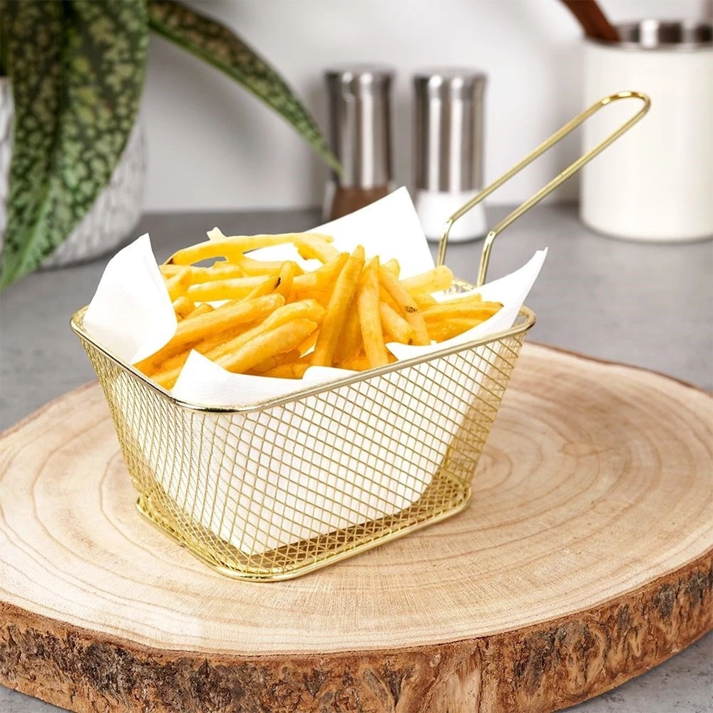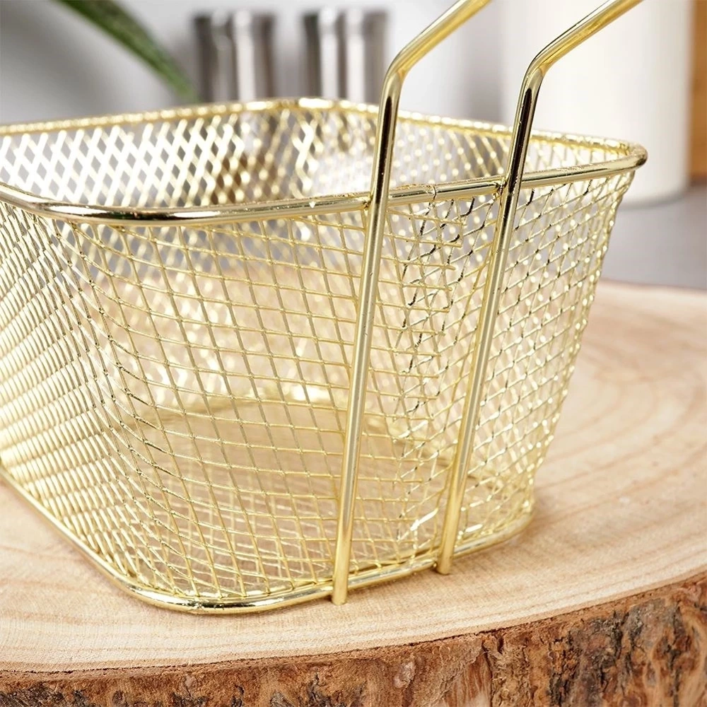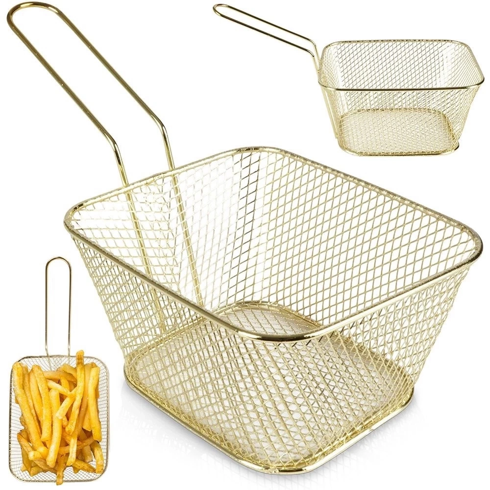 - Koszyk z uchwytem do efektownego serwowania frytek, grillowanych warzyw, nuggetsów. Wykonany ze stali nierdzewnej w złotym kolorze.