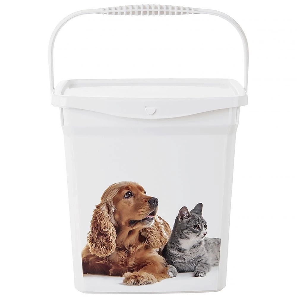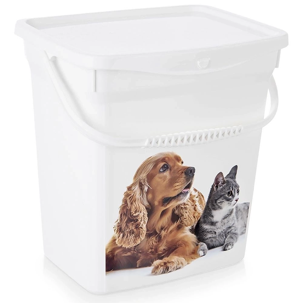 - SOLIDNY - Wykonany z tworzywa w białym kolorze. Na froncie pojemnika znajduje się grafika przedstawiająca psa i kota. Pojemnik posiada atest BPA Free. Odporny na temperatury od -25°C do +95° C.