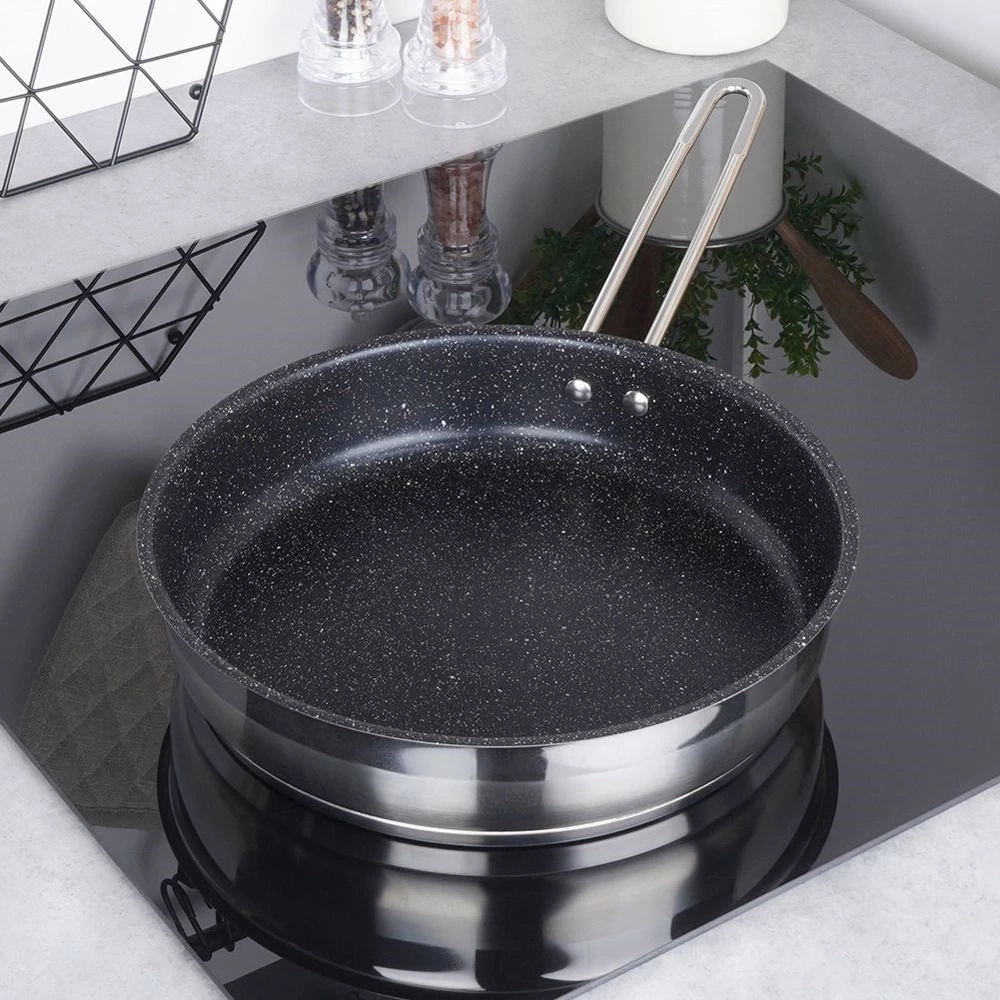 - NIEPRZYWIERAJĄCA - Wewnątrz patelni została użyta powłoka granitowa, która jest nieprzywierająca, odporna na zarysowania i wysokie temperatury. Dzięki niej przygotujemy pyszne i zdrowe dania, których składniki zachowują swój autentyczny smak i wartości odżywcze. Twoje potrawy będą zdrowe i smaczne.