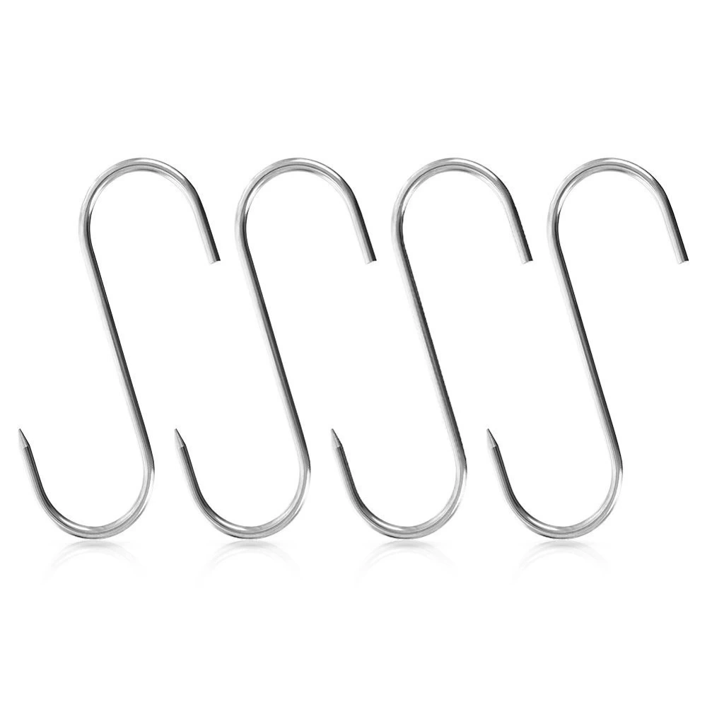 - Zestaw 4 szt. haków wędzarniczych w kształcie litery S. Wykonane ze stali nierdzewnej. Posiadają z jednej strony ostre zakończenie.