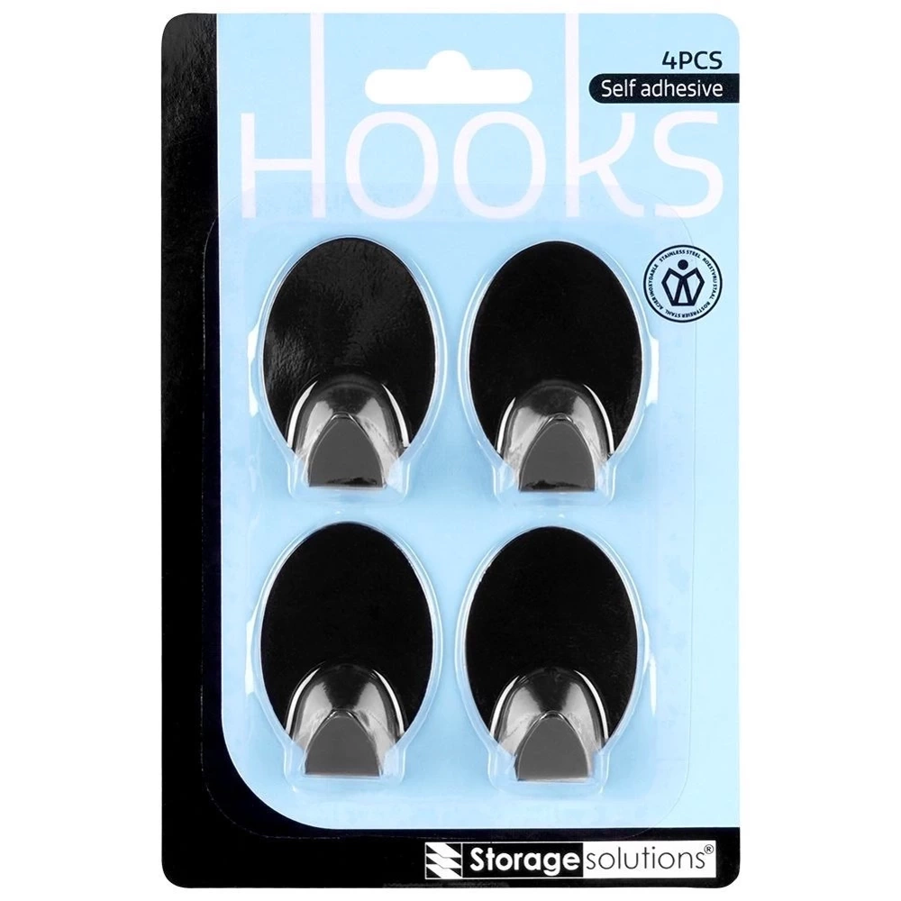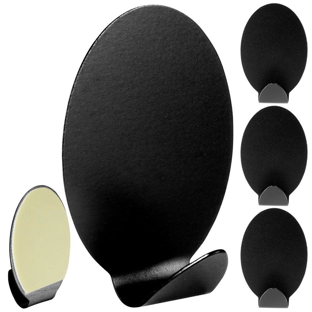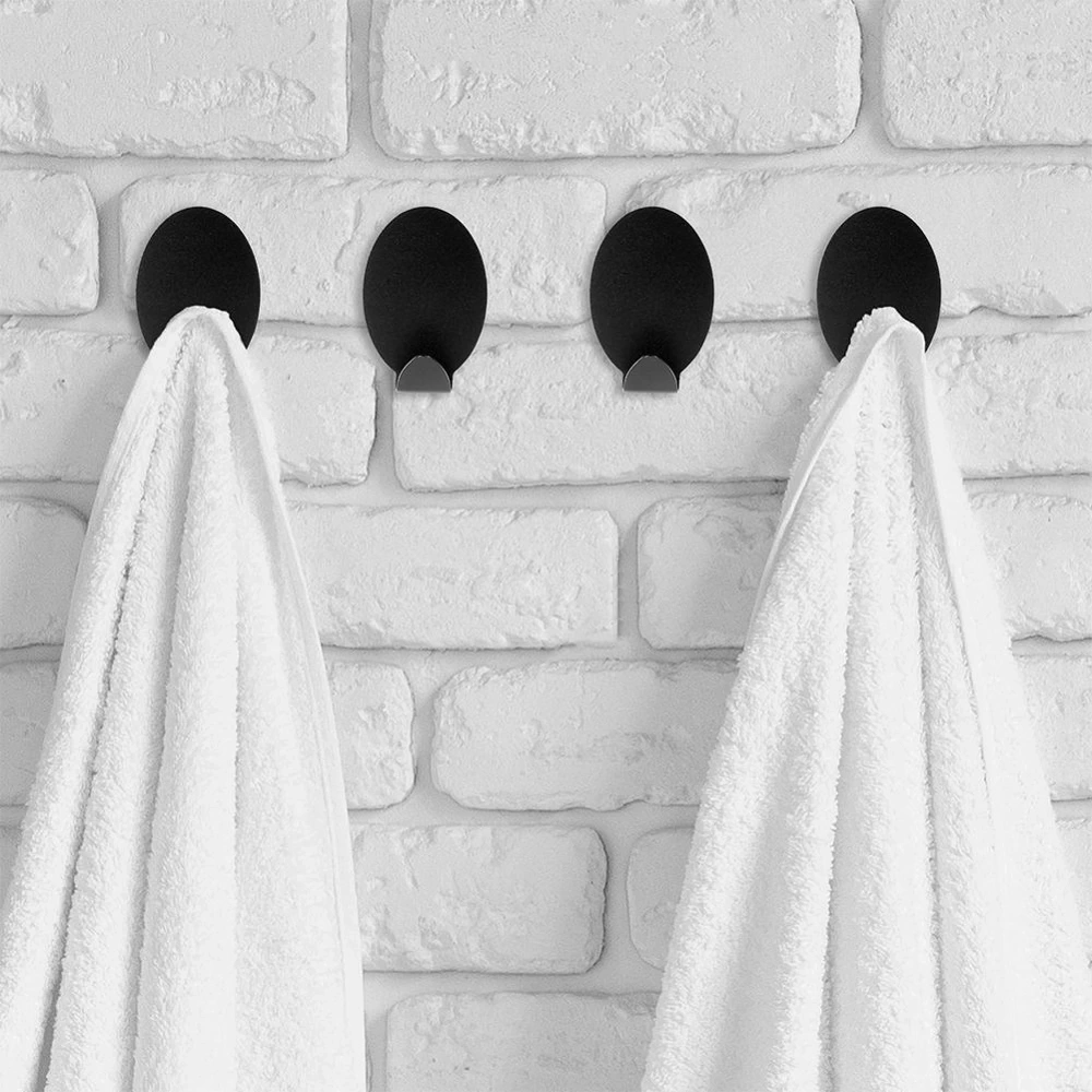 - Zestaw 4 sztuk haczyków samoprzylepnych w owalnym kształcie. Wykonane z matowej stali nierdzewnej w czarnym kolorze. Idealne do zawieszenia ręczniczków lub ściereczek.