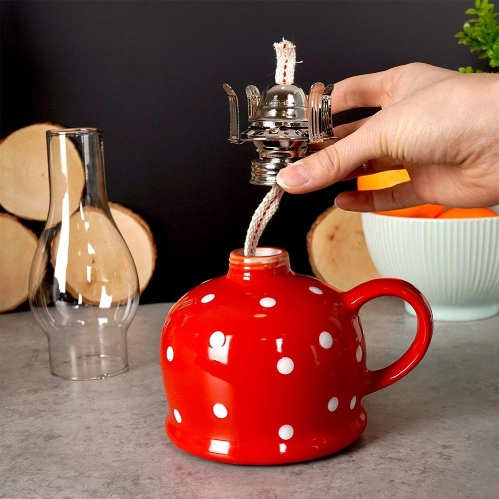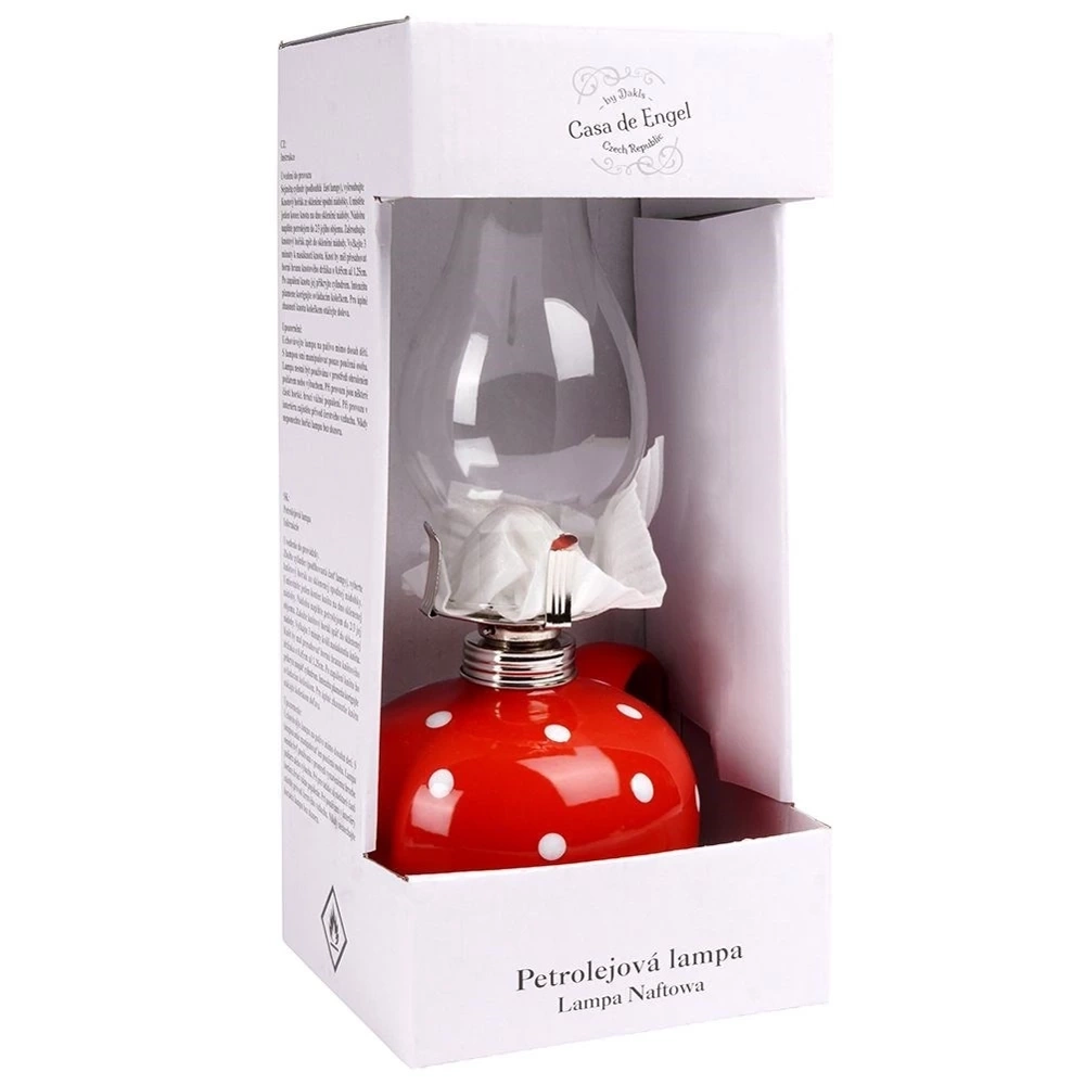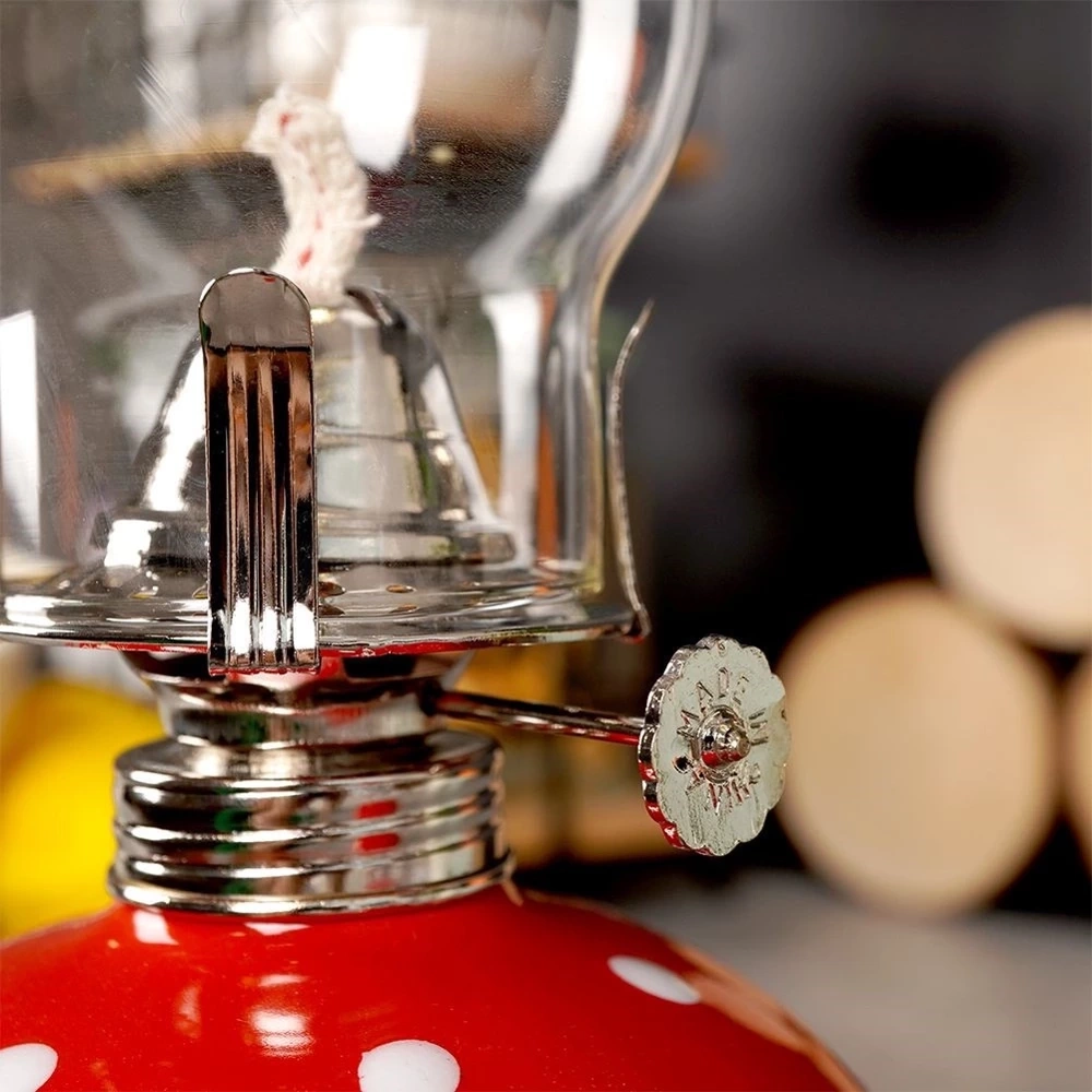 - Lampa naftowa wykonana ze szkła oraz ceramiki w efektownym czerwonym kolorze z białymi kropkami. Posiada regulowany knot a zdejmowany klosz ułatwi zapalanie.