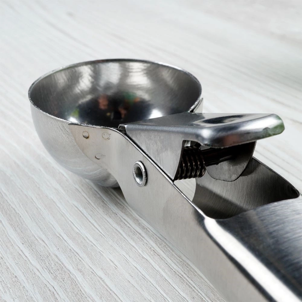 - Łyżka do nakładania lodów. W całości wykonana ze stali nierdzewnej. Dzięki niej stworzysz jednolite lodowe kulki. Można nakładać nią również ryż oraz puree.