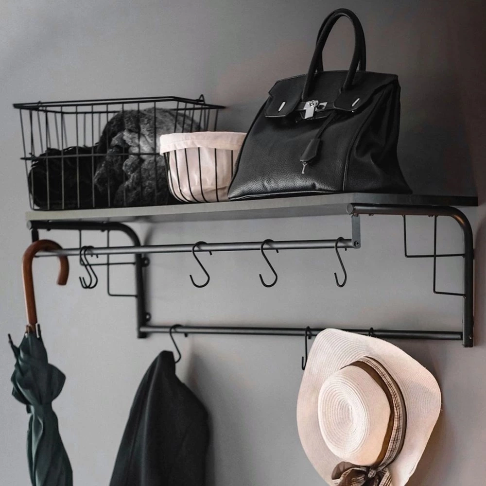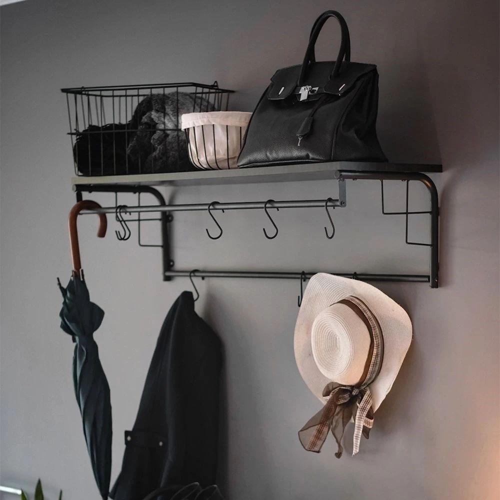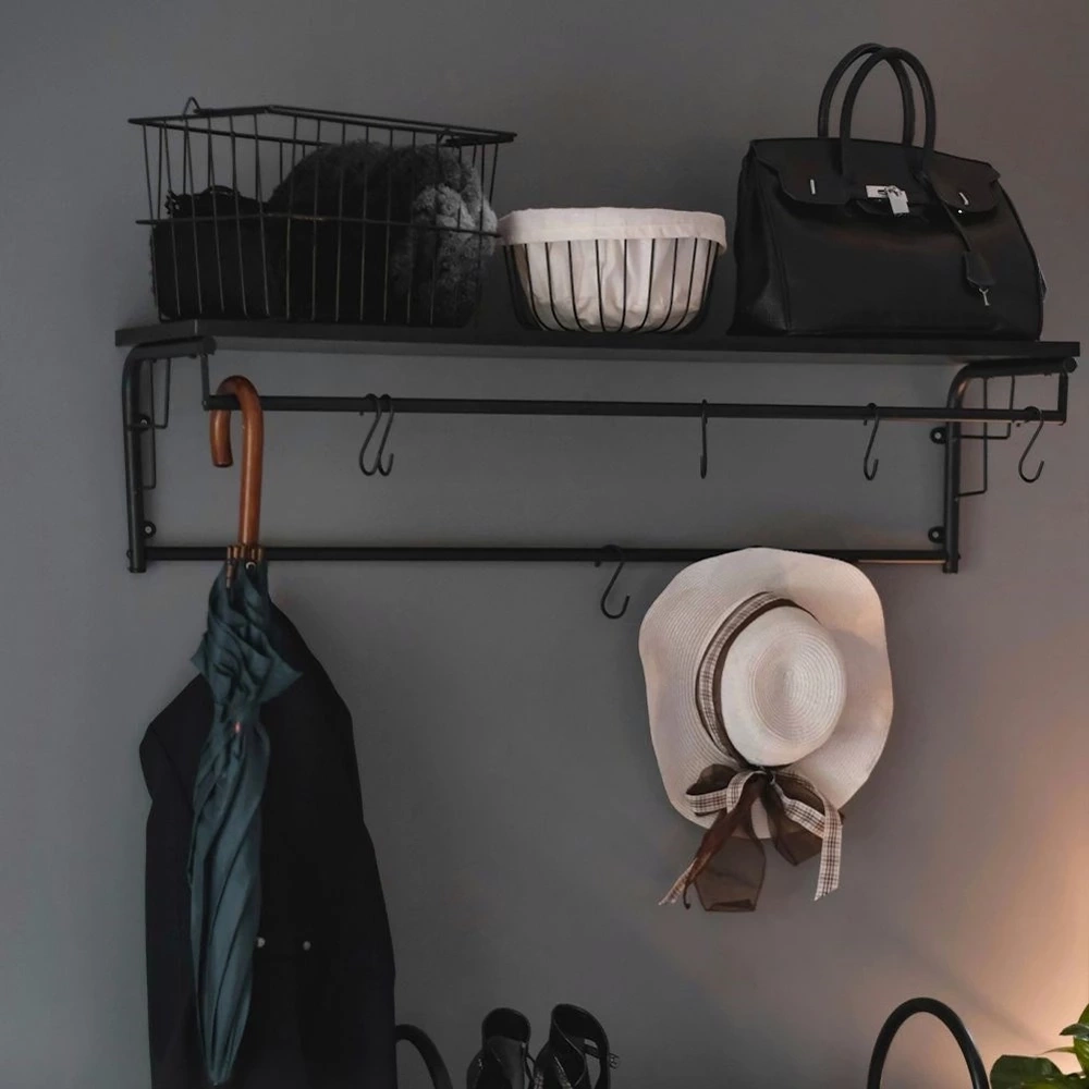 - Półka z wieszakami w zestawie 8 haczyków. Idealna do przedpokoju, korytarza a nawet poczekalni. Dzięki niej wygodnie odwiesimy kurtki oraz odłożymy czapki i torebki.