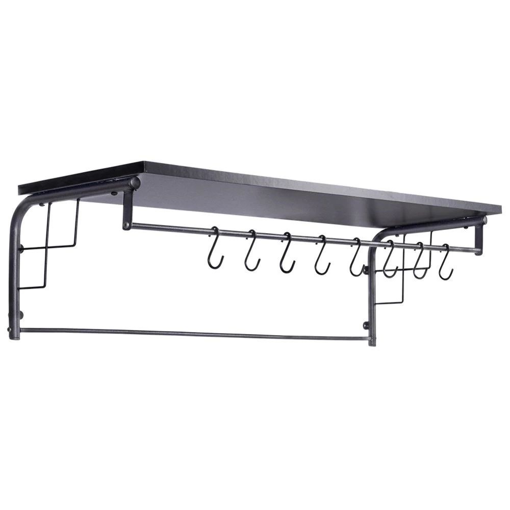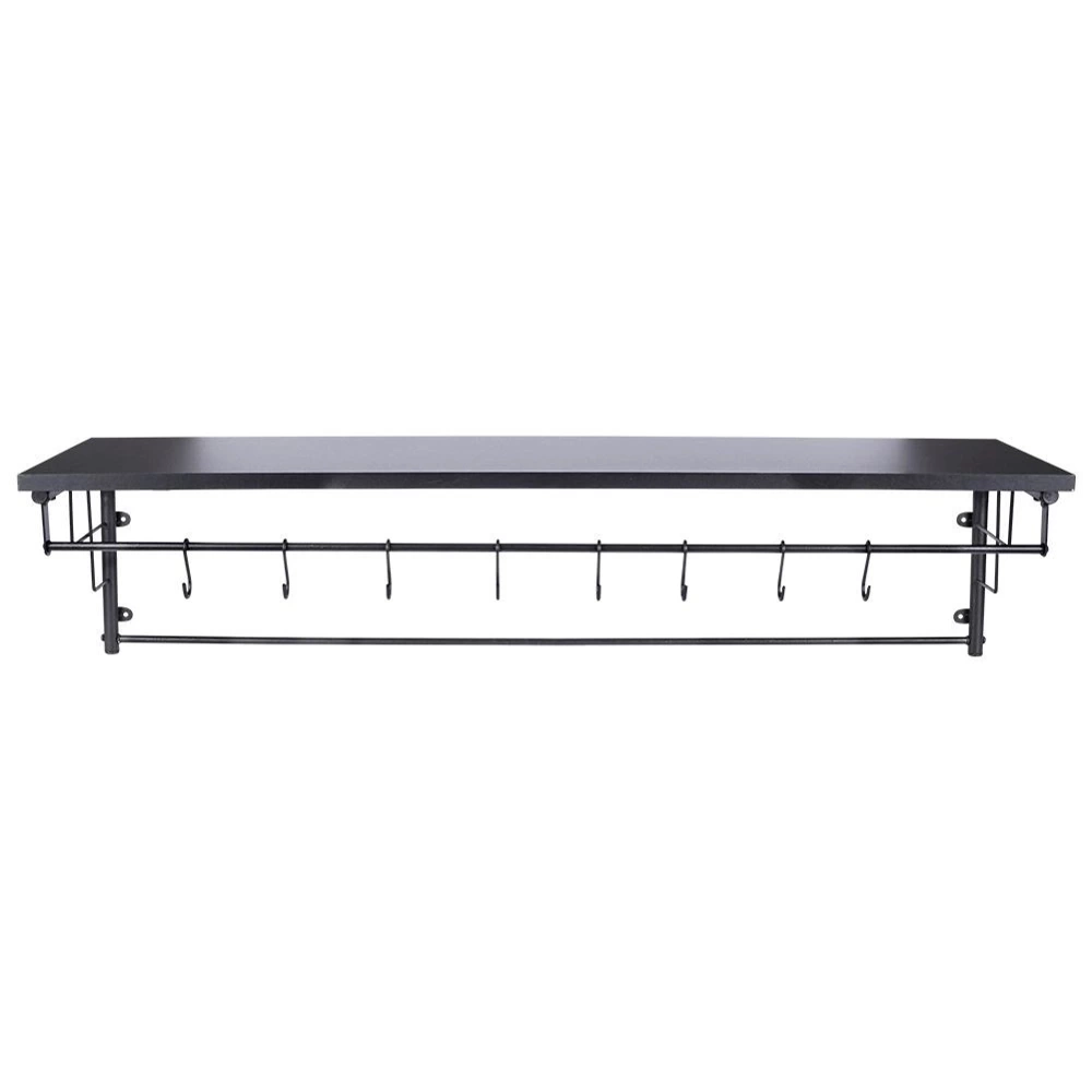 - SOLIDNA - Stelaż i wieszak wykonany z metalu w czarnym kolorze, a półka z drewna malowanego na czarno. Półka jest solidna, dzięki czemu żaden z elementów nie będzie się wyginać.