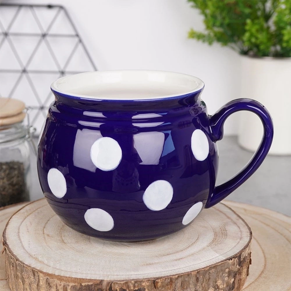 - SOLIDNY - Wykonany z wysokiej jakości ceramiki w granatowym kolorze z dekorem w postaci białych, dużych kropek. Odpowiednio użytkowany posłuży długie lata.