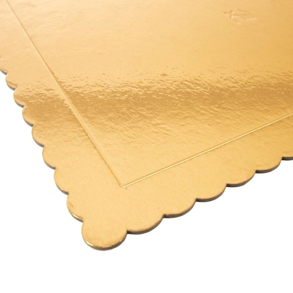 - Podkładka pod tort o wymiarach 40x30 cm z karbowanymi bokami. Wykonana z grubej tektury, powlekanej z obu stron folią w kolorze złotym. Stanowi element dekoracyjny.