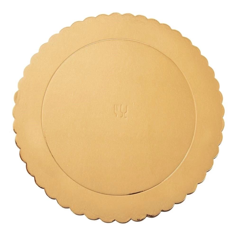 - Podkładka pod tort o średnicy 26 cm z karbowanymi bokami. Wykonana z grubej tektury, powlekanej z obu stron folią w kolorze złotym. Stanowi element dekoracyjny.