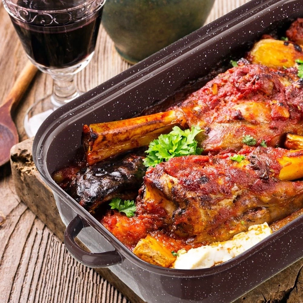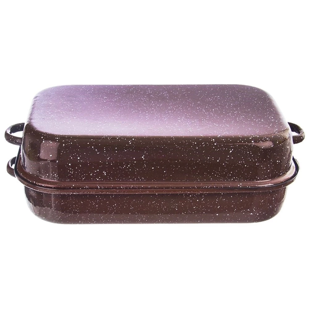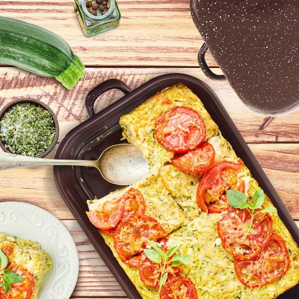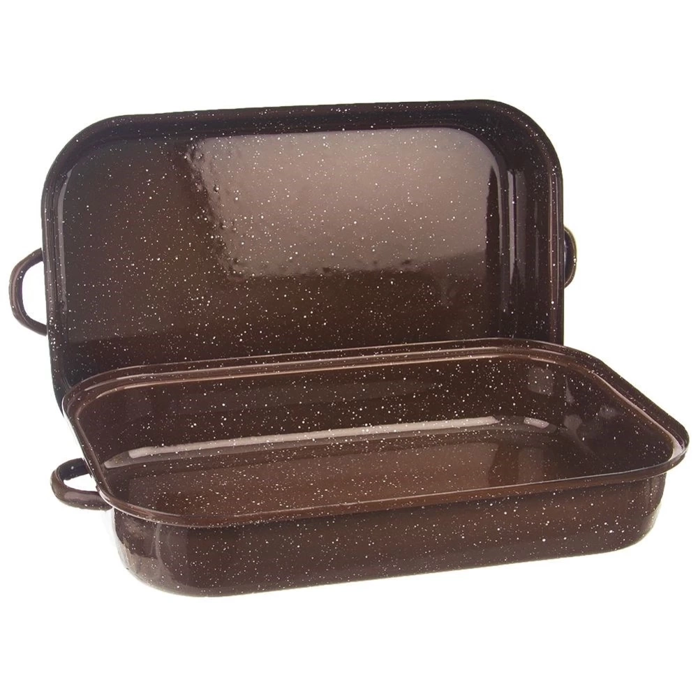 - Brytfanna wykonana ze stali emaliowanej. Świetnie sprawdzi się do pieczenia oraz serwowania potraw. Posiada zdejmowaną pokrywkę, która pełni rolę naczynia. Wyposażona w uchwyty.