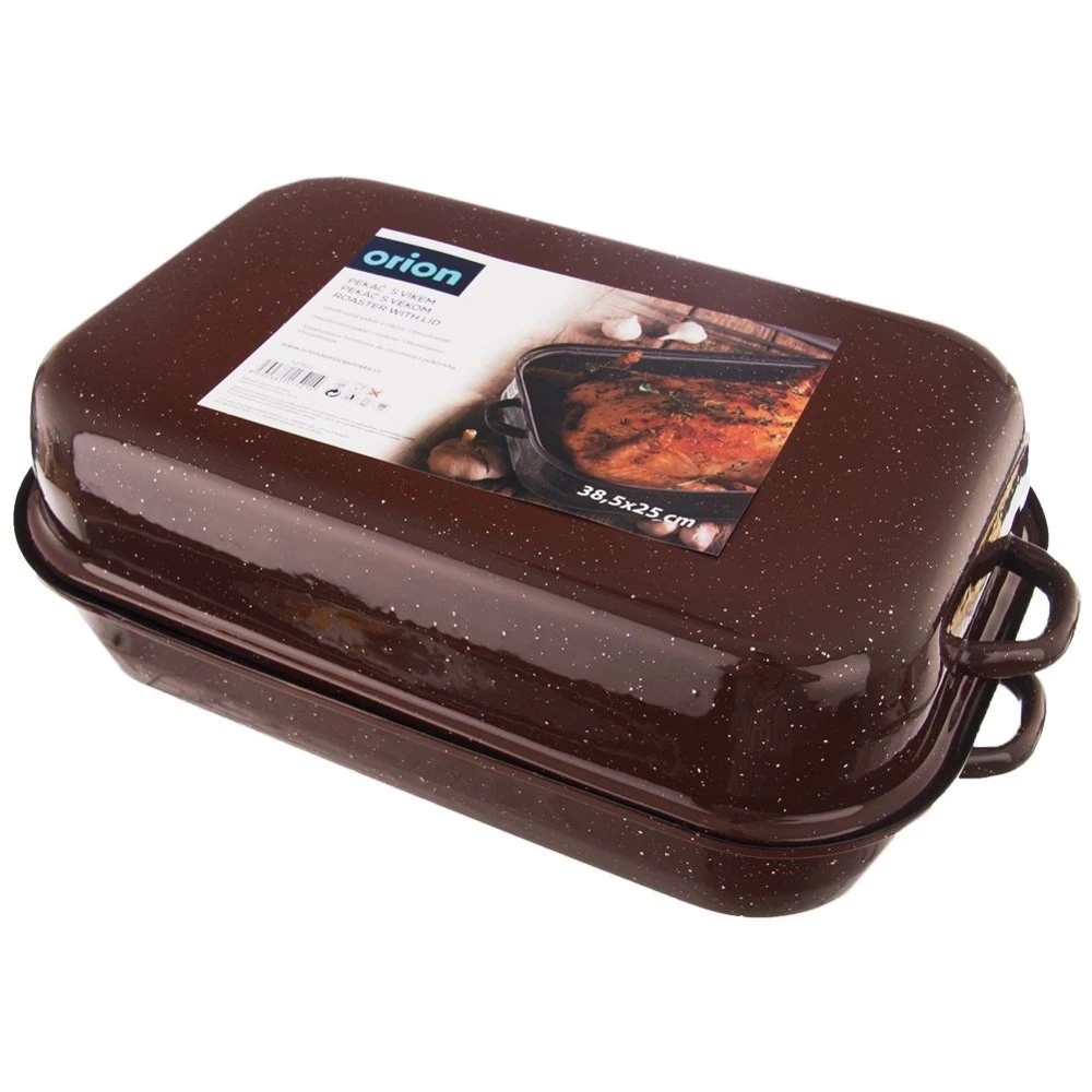 Emaliowana brytfanna z pokrywką, znajdzie szerokie zastosowanie w kuchni. Pokrywa z uchwytami może pełnić również rolę naczynia do zapiekania lub serwowania, zyskujemy wówczas dwa naczynia bez przykrycia. Naczynia emaliowane mogą posiadać niedoskonałości produkcyjne, które są naturalne dla tego typu naczyń: wybrzuszenia, niesymetryczne nadruki itp. Nie wpływają one na jakość produktu i przygotowywanych potraw, a jedynie podkreślają ich metodę tradycyjnego wykonania. Oryginalny produkt czeskiej marki Orion. Wyprodukowano zgodnie z europejskimi standardami.