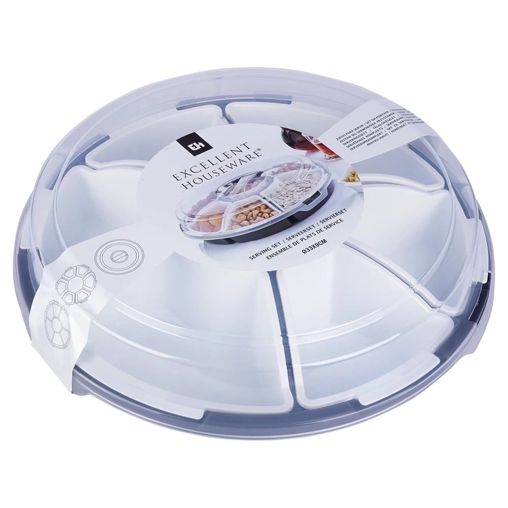 - PRZYDATNY - Talerz do serwowania składający się z sześciu wyciąganych wkładów i pokrywki z uchwytem. Wkłady są w dwóch różnych rozmiarach. Talerz ma średnicę 33 cm, wysokość 8 cm, wysokość z pokrywką 9 cm. Wewnątrz znajduje się otwór o średnicy 9 cm, który również możemy wykorzystać do przekąsek.