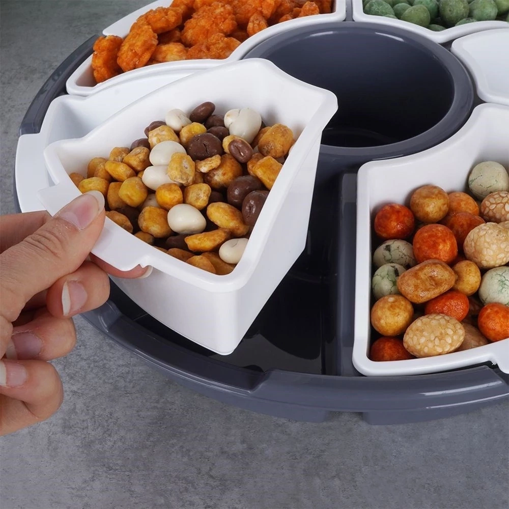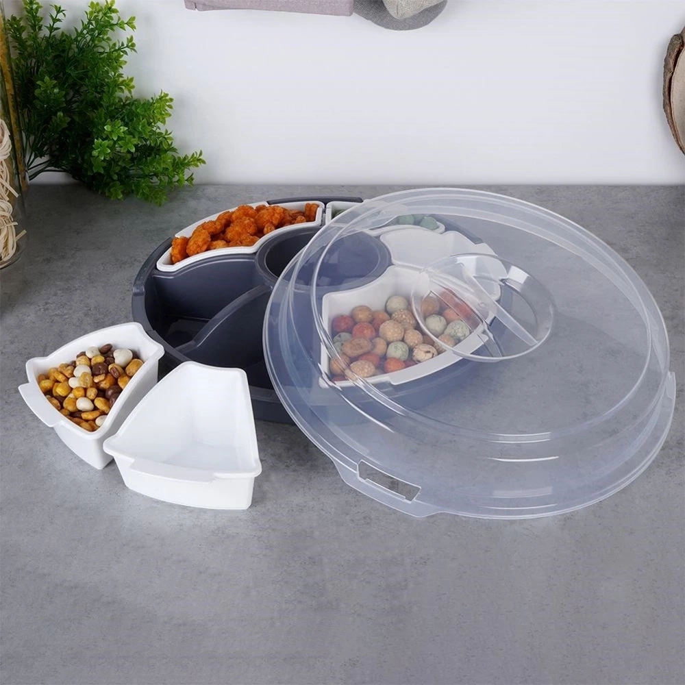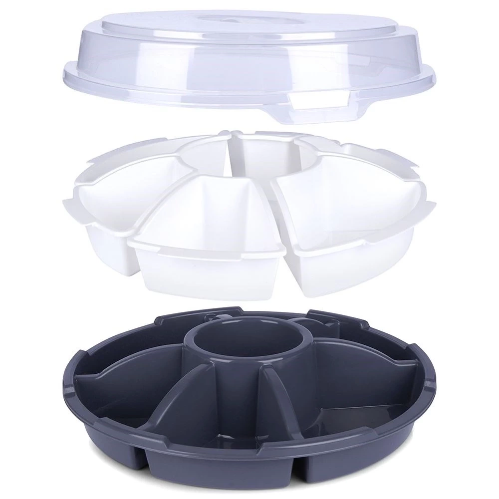 - Talerz do serwowania z pokrywką, posiadający sześć wyciąganych wkładów. Idealny na przekąski, przystawki, ale także do serwowania dipów.