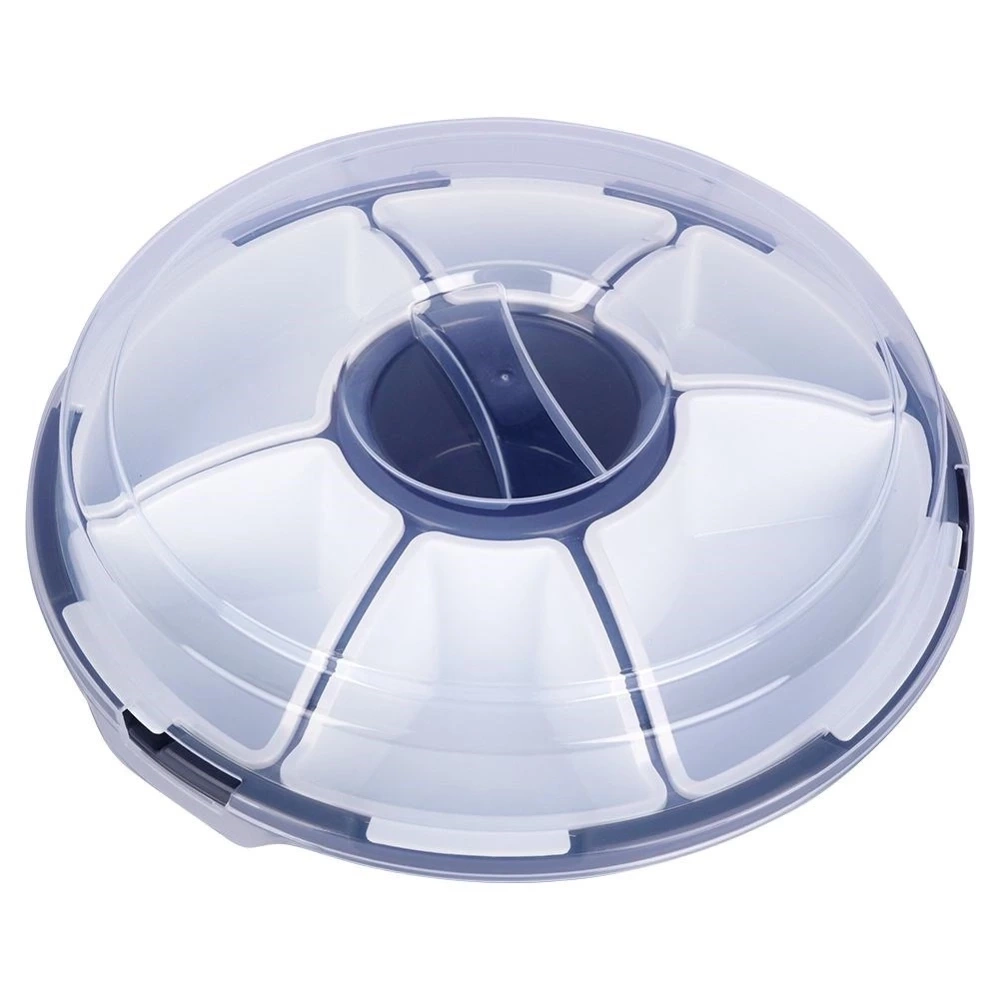 - WYTRZYMAŁY - Talerz wykonany jest z najwyższej jakości tworzywa. Talerz w kolorze szarym, wkłady w kolorze białym, a pokrywa jest przezroczysta. Nadaje się do mycia w zmywarce do naczyń.