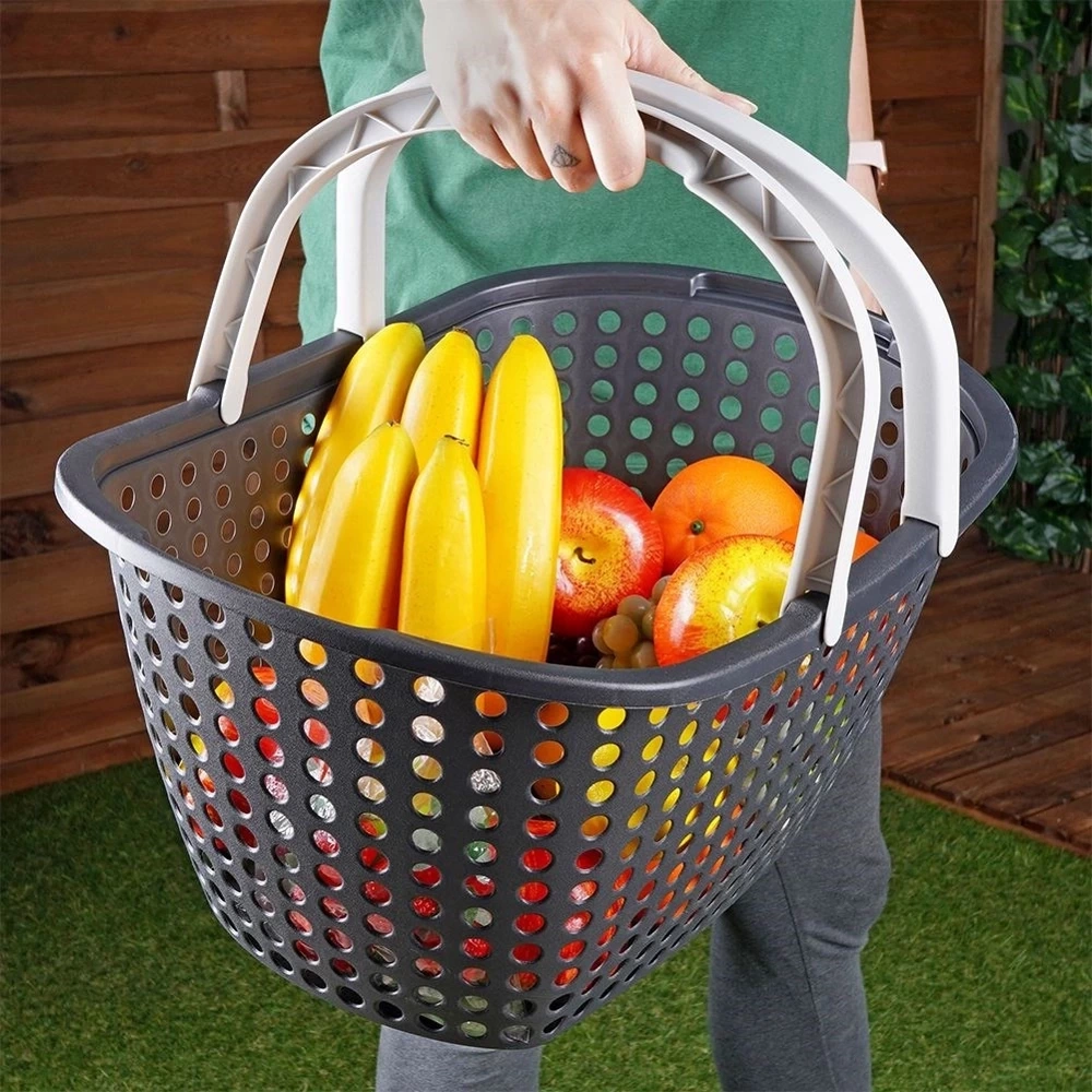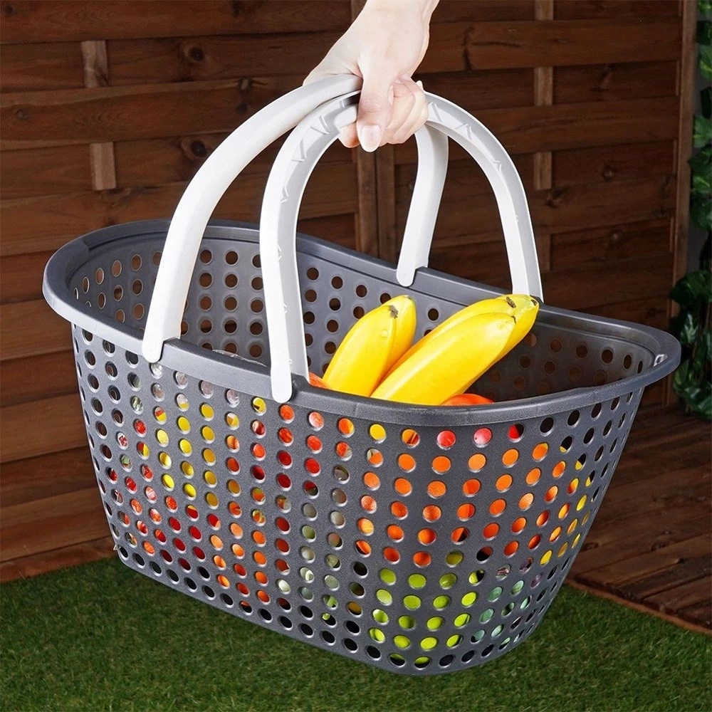 - Wygodny koszyk w kolorze antracytowym z szarymi uchwytami, idealny do przenoszenia artykułów spożywczych, posiłków i napojów, zarówno podczas zakupów, jak i pikników.