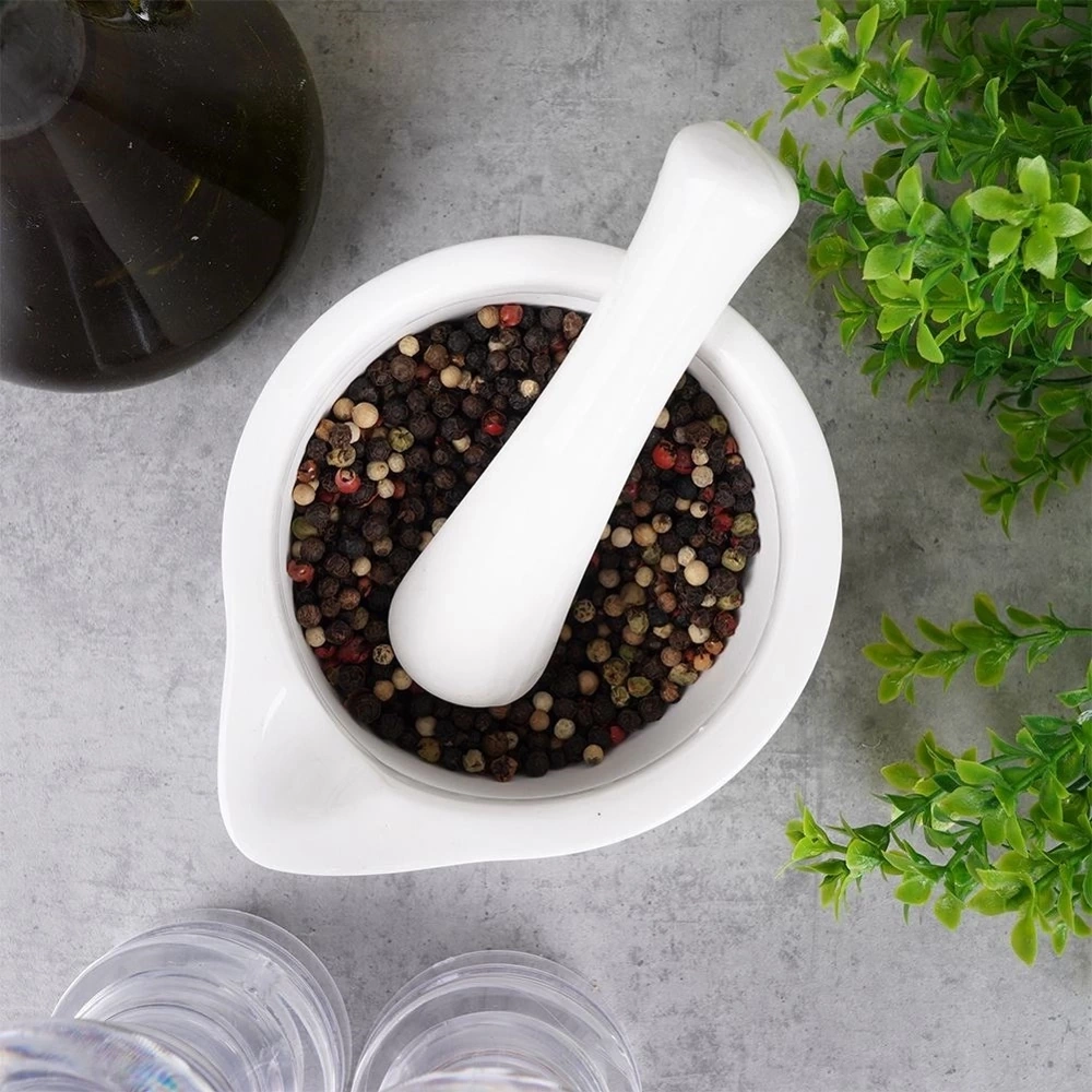 - Porcelanowy moździerz do rozdrabniania przypraw, ziół, orzechów. Idealny do przygotowywania pesto. Wewnętrzna część moździerza oraz dolna tłuczka nie są polerowane co daje lepszy efekt kruszenia.