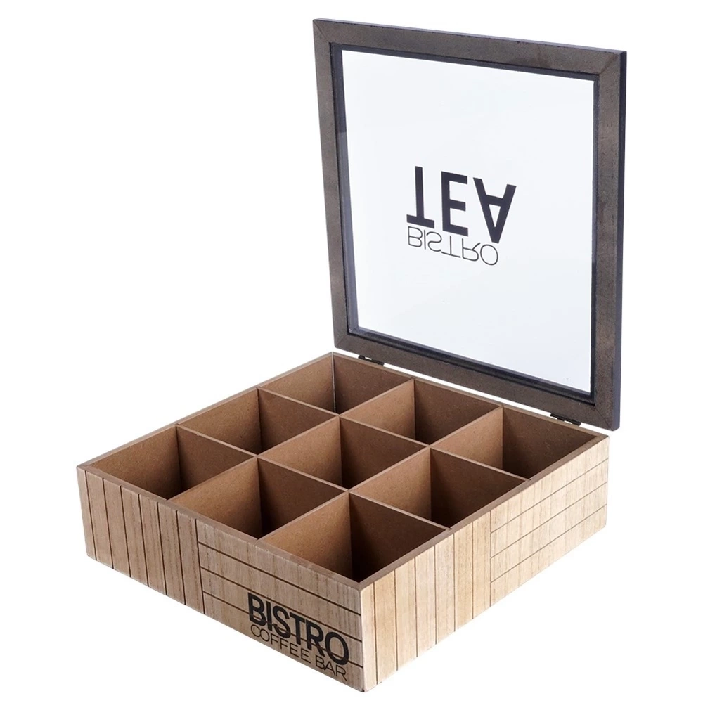 - PRZYDATNY - Pojemnik do przechowywania torebek herbaty. Posiada 9 przedziałek w których możemy umieścić ulubione herbaty. Pojemnik ma wymiary 24 x 24 x 7,5 cm. Przegródki mają wymiary 7 x 7 x 6 cm.