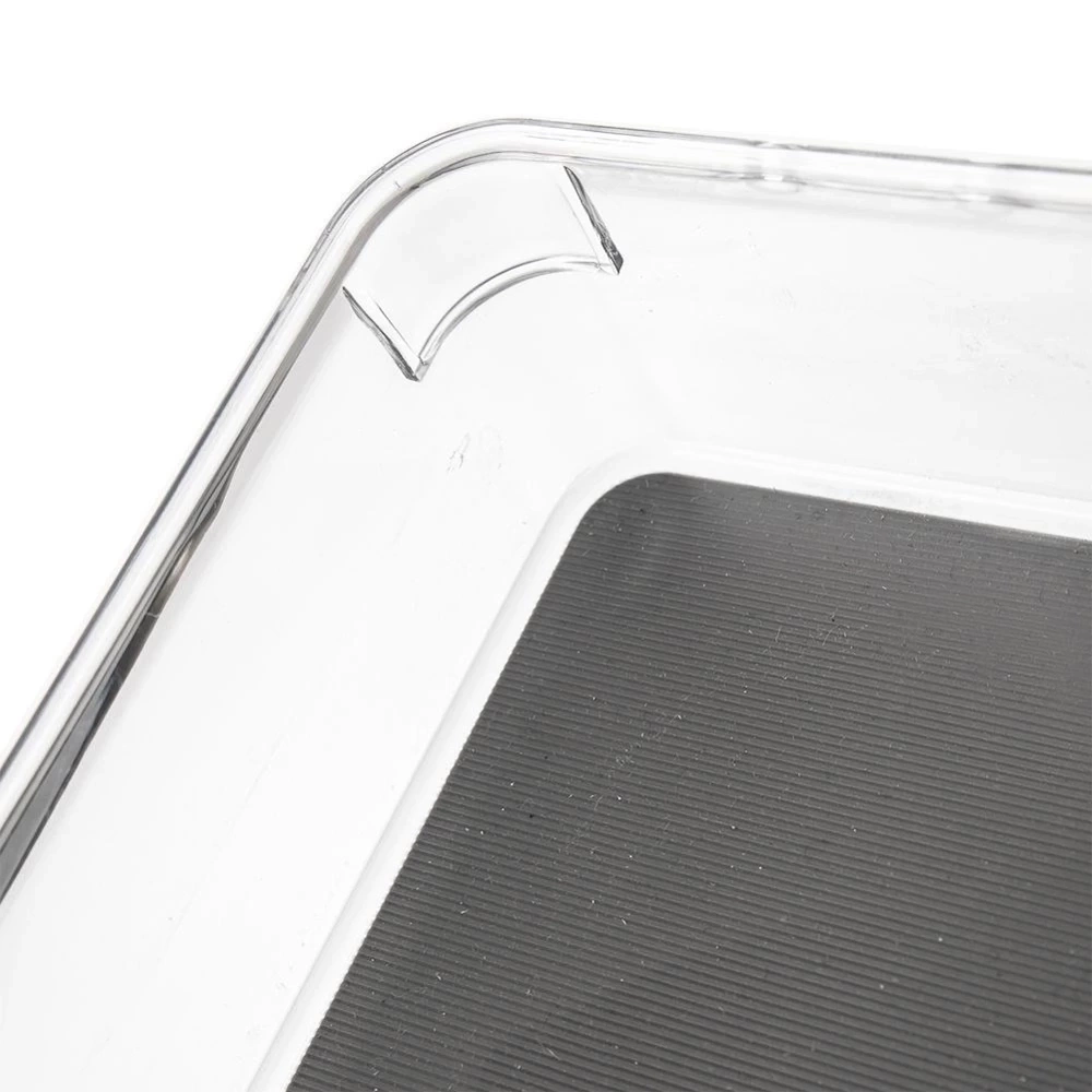 - WYTRZYMAŁY - Wykonany z najwyższej jakości, przezroczystego tworzywa. Wewnątrz posiada matę wykonaną z termoplastycznej gumy w szarym kolorze. Pojemnik jest wytrzymały i solidny. W razie potrzeby matę można wyjąć i przemyć w ciepłej wodzie z dodatkiem detergentu.