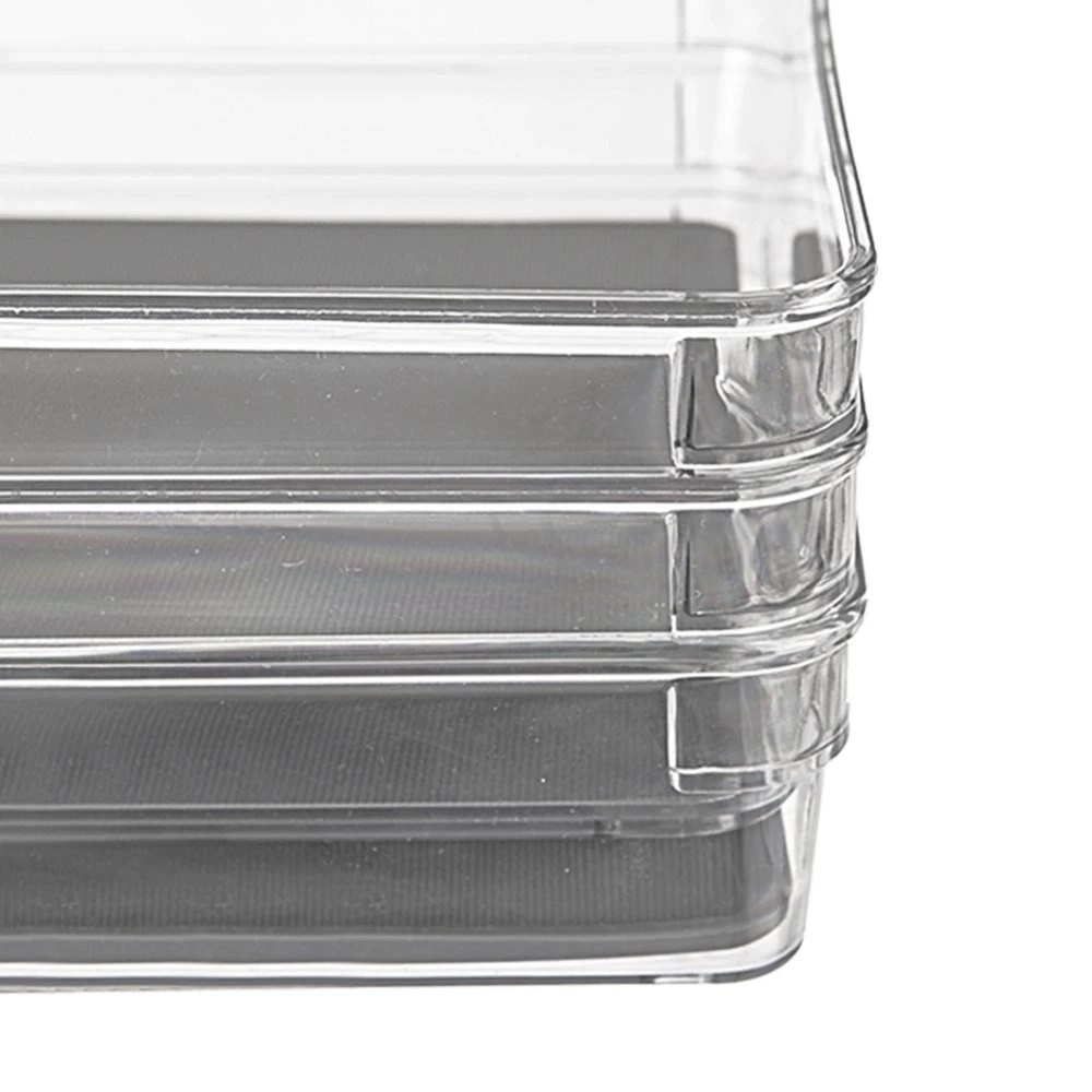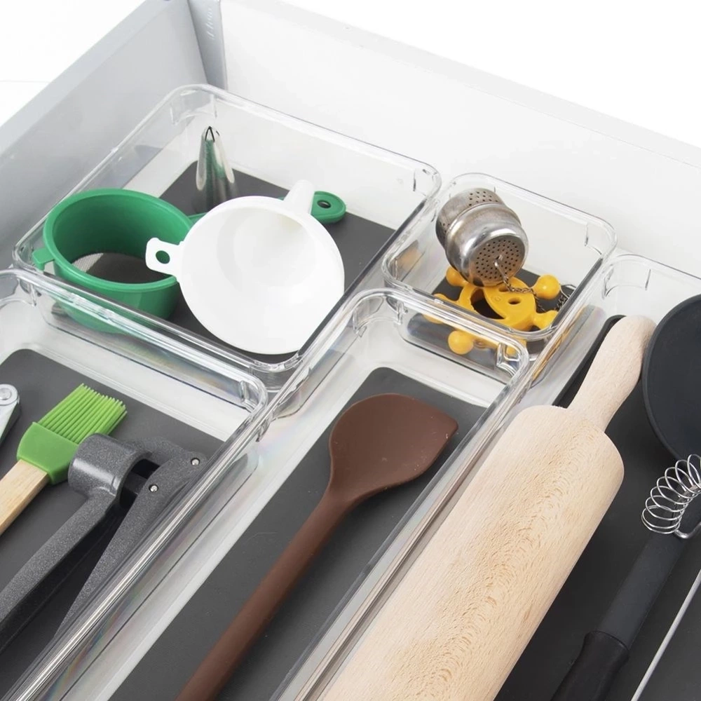 - Pojemnik do przechowywania różnych przedmiotów w szufladzie lub szafce. Wykonany z przezroczystego tworzywa. Posiada antypoślizgowe nóżki oraz gumową matę wewnątrz.