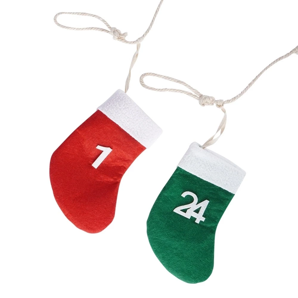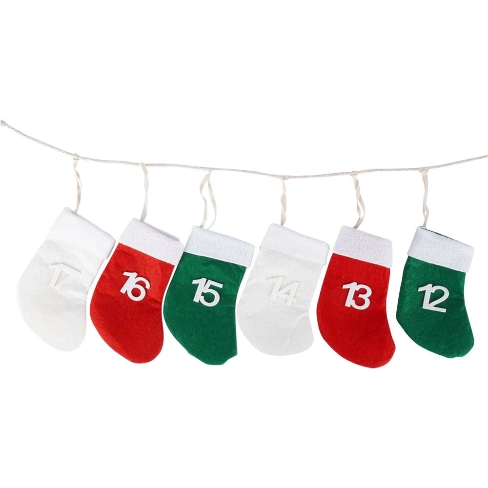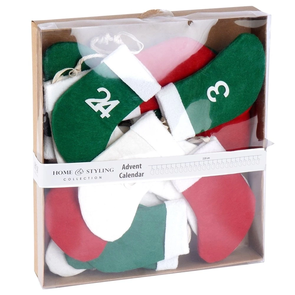 - FILCOWY - Kalendarz składa się z 24 skarpet wykonanych z filcu, zawieszonych na sznureczku. Skarpety utrzymane w czerwonej, zielonej i białej kolorystyce, każdy skarpeta ma wymiary 9 x 14,5 cm.