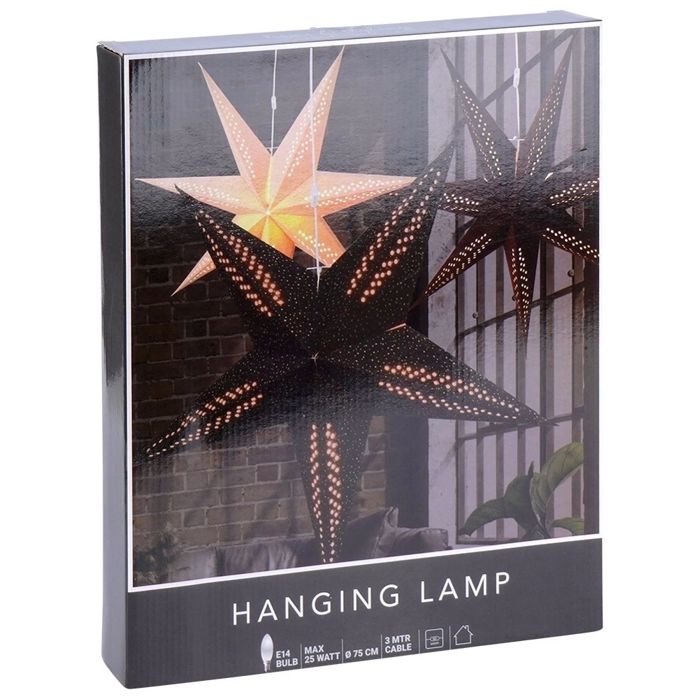 - DO ZAWIESZENIA - Gwiazda świąteczna do zawieszenia. Gwiazda ma formę 3D i średnicę 75 cm. W zestawie sznurek za pomocą którego zawiesimy gwiazdę. Świetnie sprawdzi się zawieszona w oknie, na ścianie lub w dowolnym miejscu.