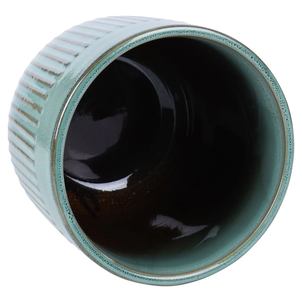 - Szkliwiona doniczka na roślinę. Wykonana z porcelany w zielonym kolorze. Posiada ryflowania na powierzchni i delikatny połysk, co nadaje jej wyjątkowy wygląd.