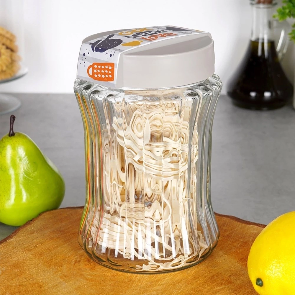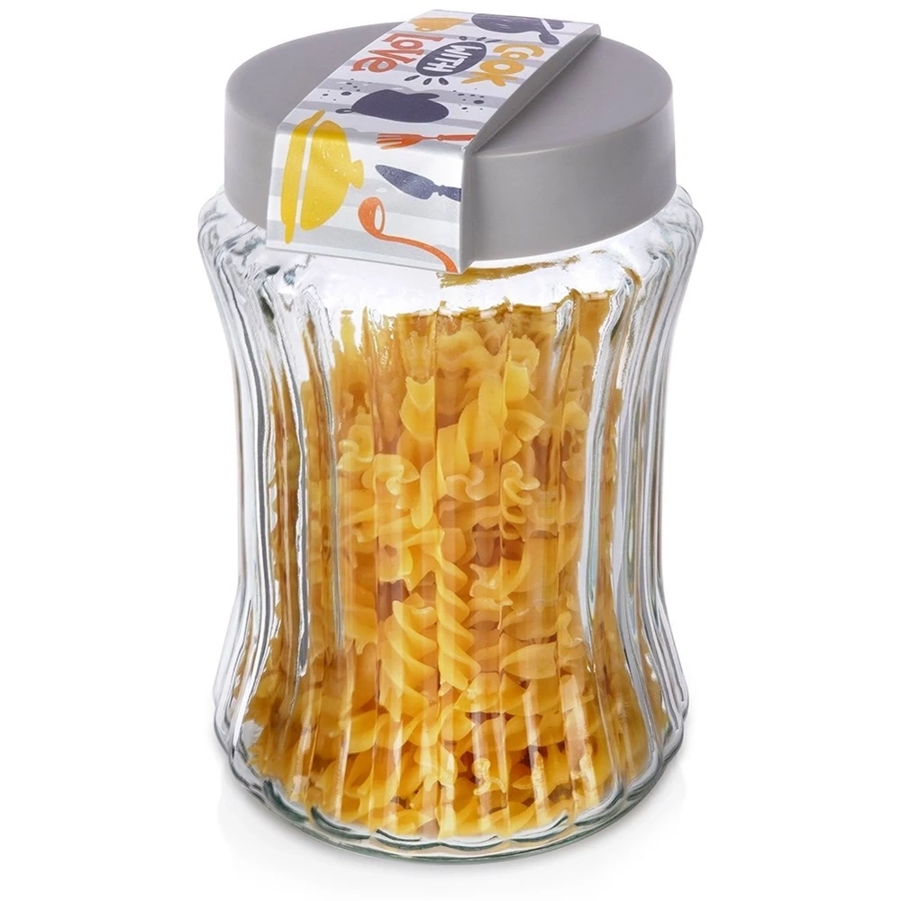- SZKLANY- Pojemnik wykonany z grubego, przezroczystego szkła, posiada efektowne zdobienia na powierzchni. Wyposażony w pokrywkę wykonaną z najwyższej jakości tworzywa w jasnym, szarym kolorze z kolorowym dekorem z motywem kuchennym. Bezpieczny dla zdrowia i neutralny dla żywności, nie zawiera BPA. Nadaje się do mycia w zmywarce do naczyń.