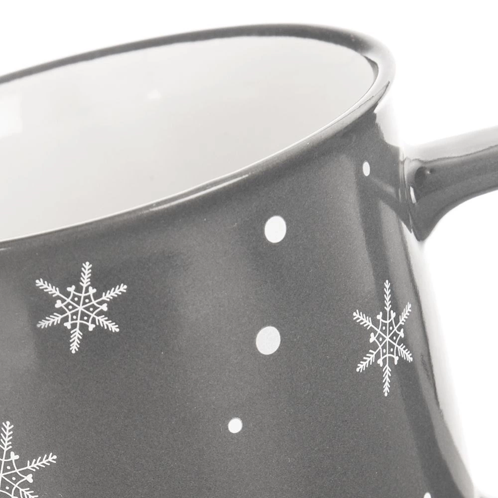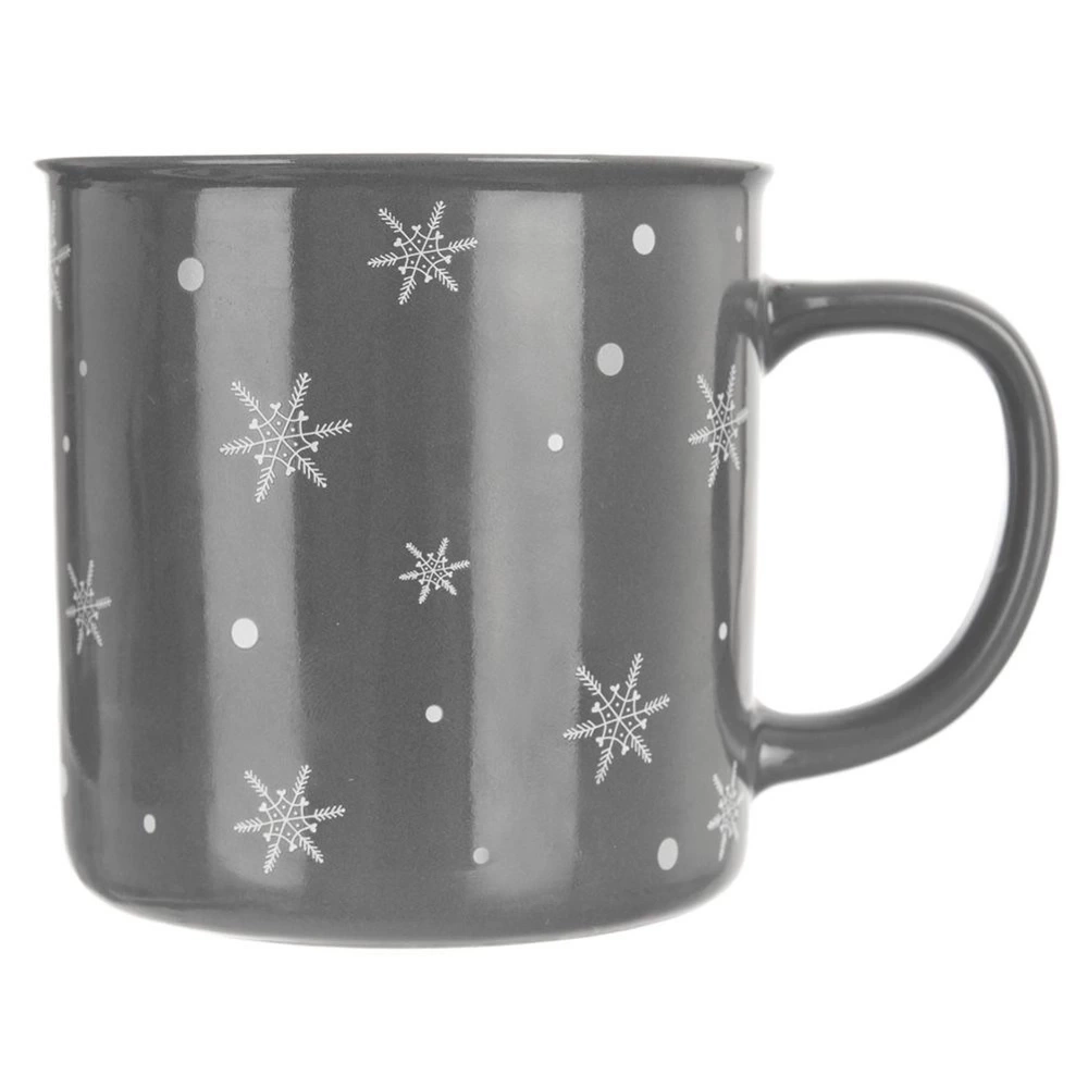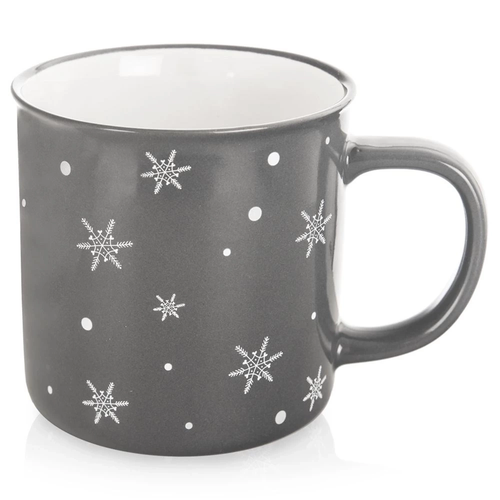 - Kubek do picia kawy, herbaty, ziół i innych napojów. Wykonany z ceramiki w szarym kolorze z motywem płatków śniegu. Posiada wygodny uchwyt. Nadaje się do zmywarki i mikrofalówki.